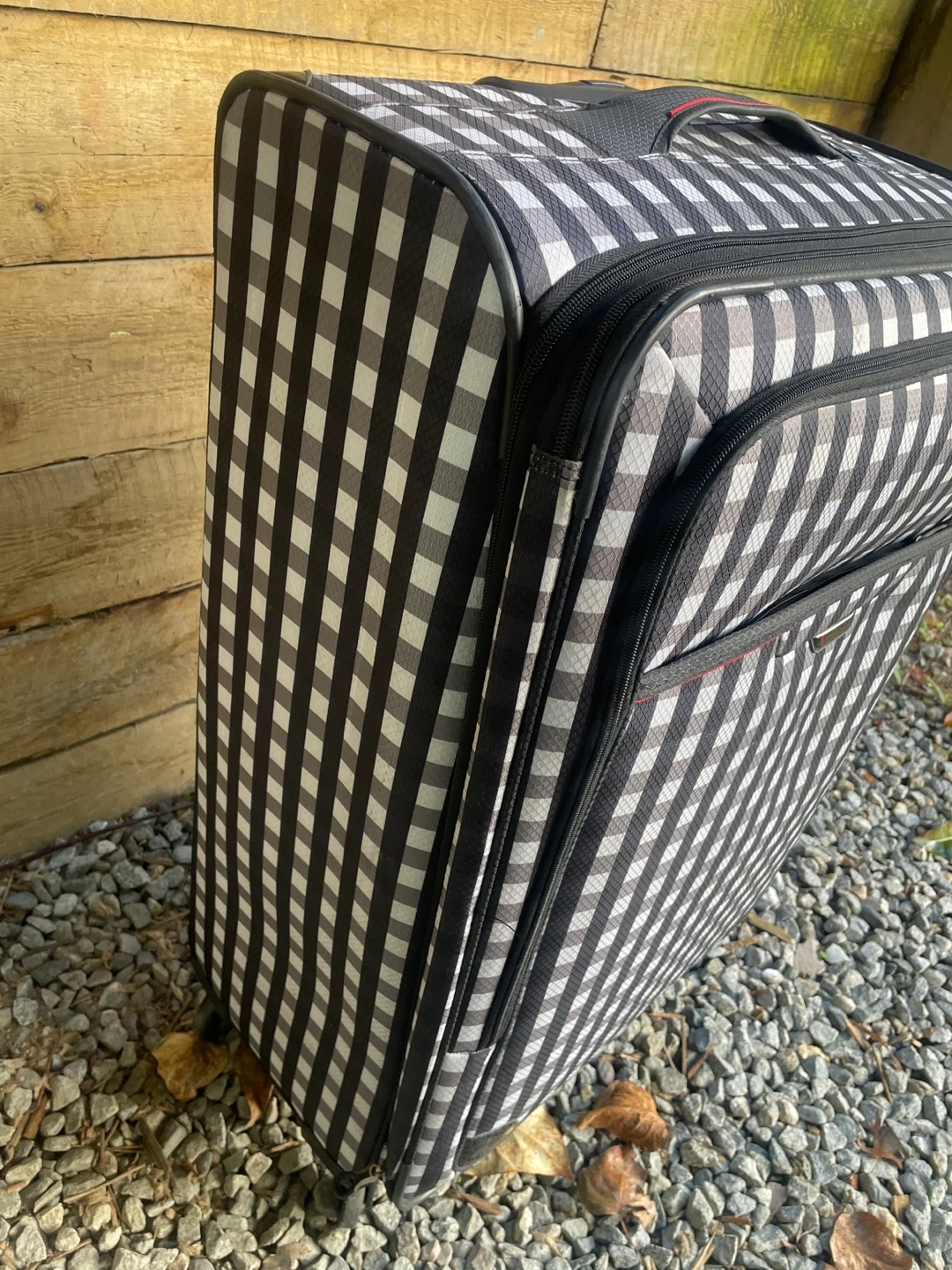 Selling a Ricardo Beverly Hills checked luggage suitcase. It has a black and white checkered pattern on the outside, with a bright red and white striped interior lining. Perfect for your next trip! Used one time. 28” x 20”