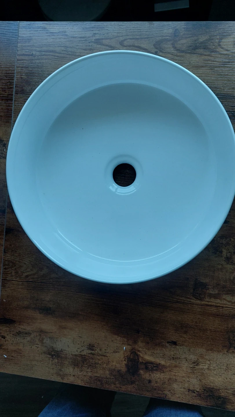 54Selling a white ceramic vessel sink. It measures about 16 inches across and 5 inches tall. It's still in its original box!