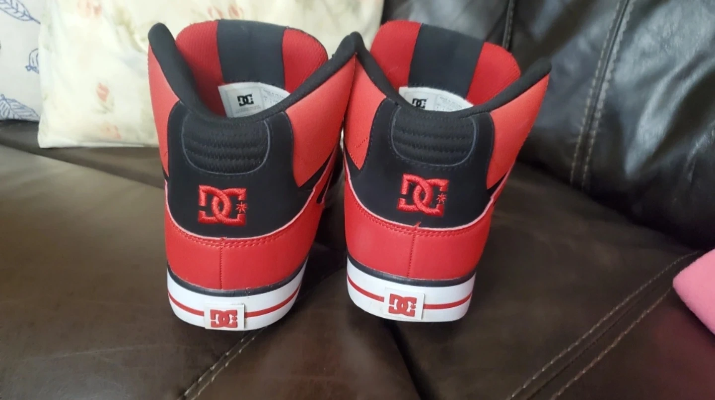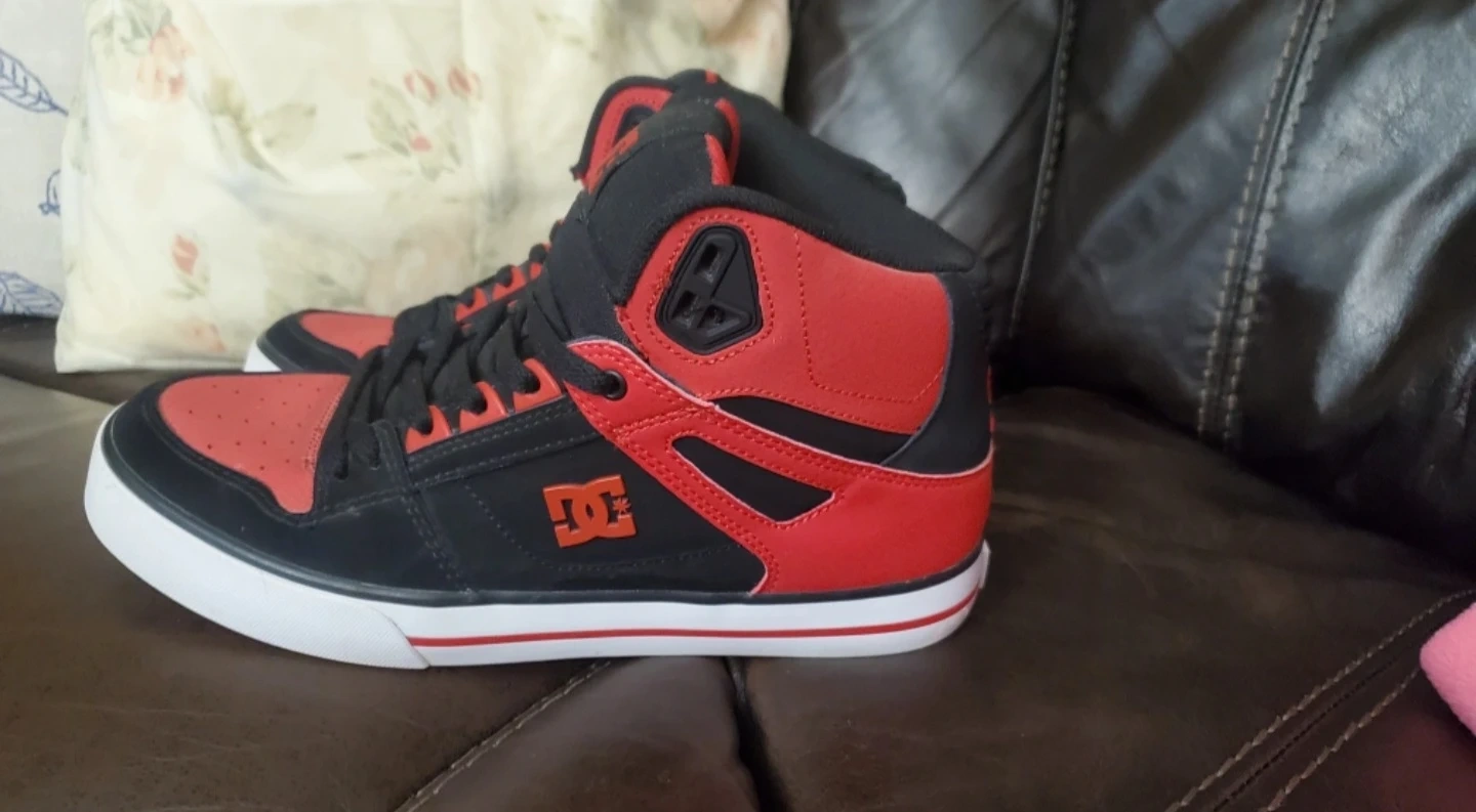 Selling a pair of DC high-top sneakers in a striking red and black colour combo! They're in great shape, only wore twice and ready for a new home. Perfect for adding a pop of colour to your outfit or hitting the skate park. Must pick up, cash only.