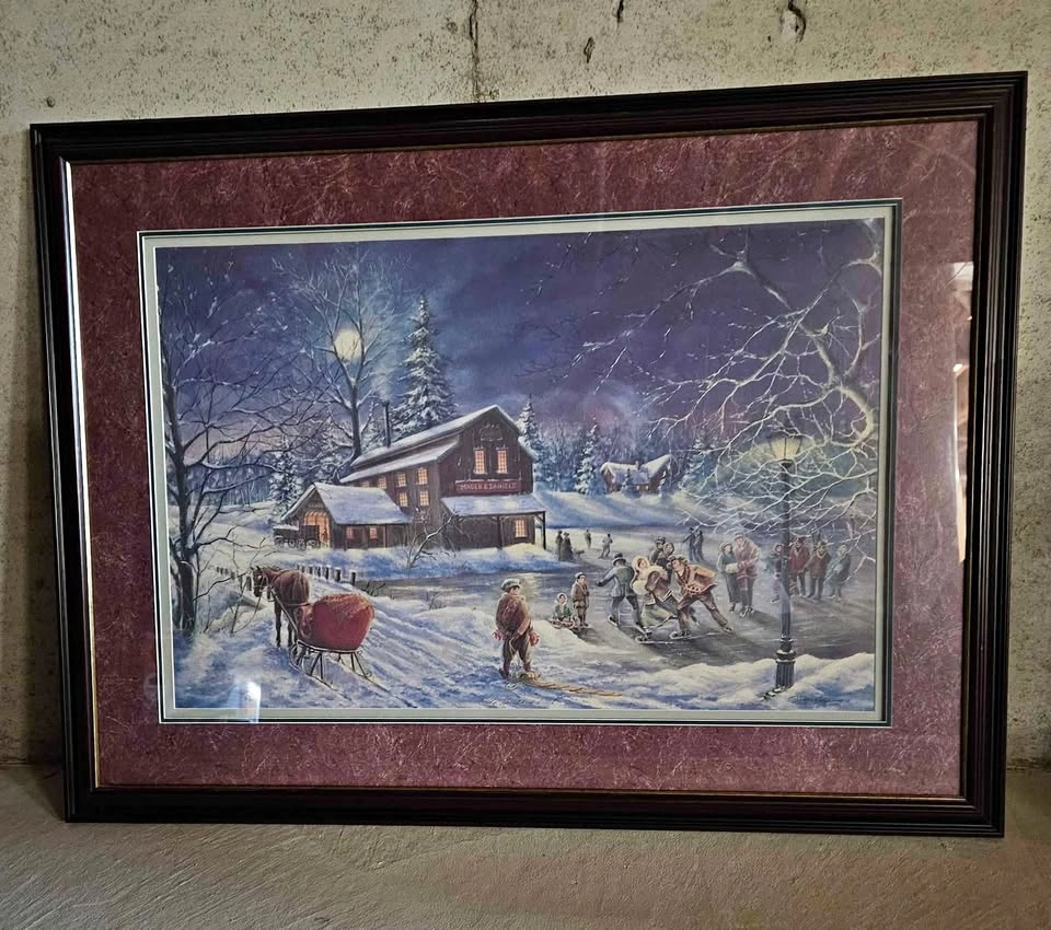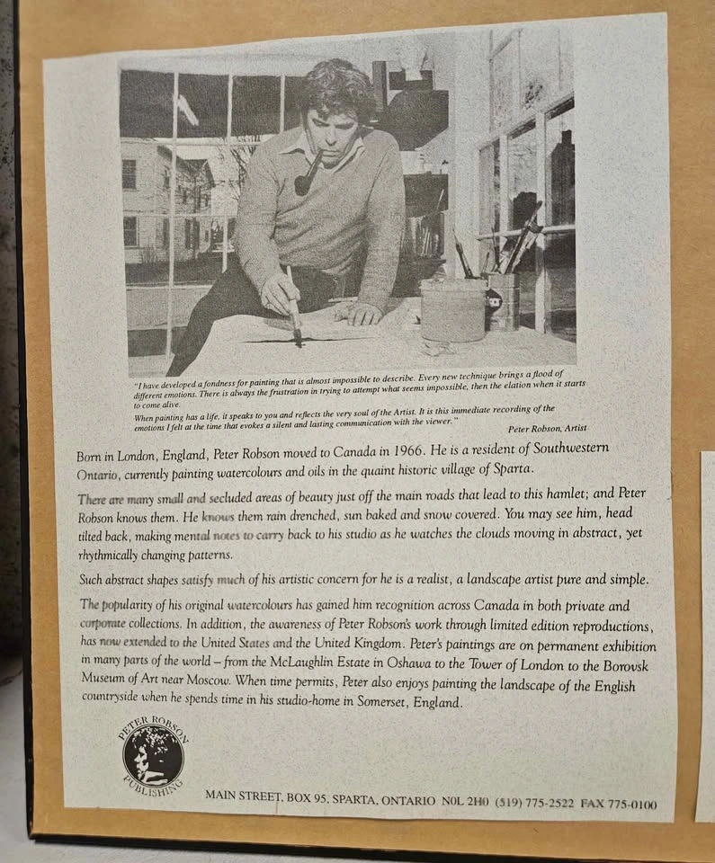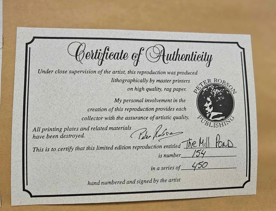 Custom framed limited edition print of Richmond Hill's Mill Pond in the early years by artist Peter Robson. Matted in a 2" wood frame with gold trim. Frame is a dark burgundy to match the course of the print. Includes Peter Robson's story and certificate of authenticity Print inside mat: 30"w x 20" h 3 layer mat: 4" Print including wood frame: 40"w x 31"h