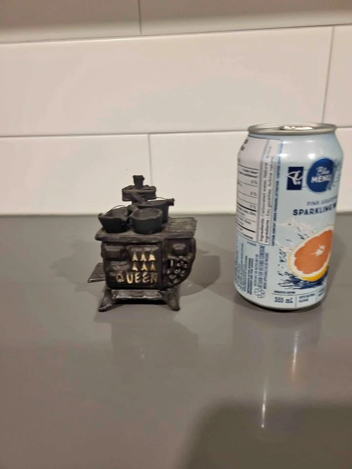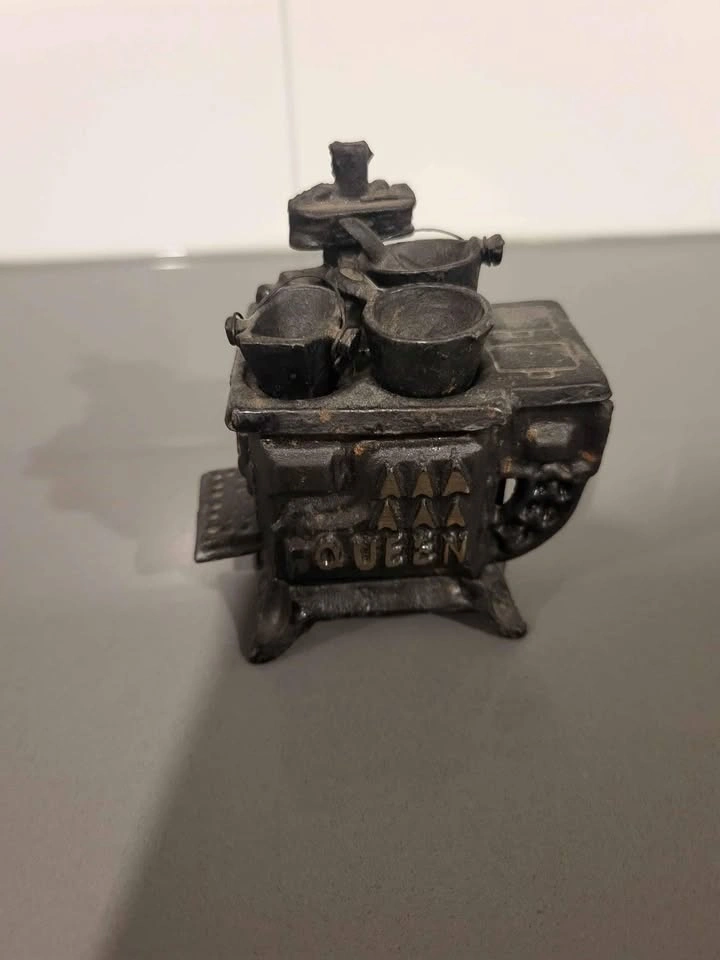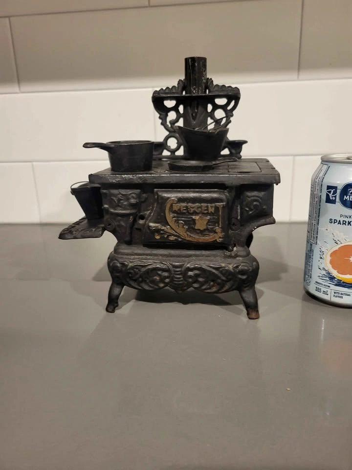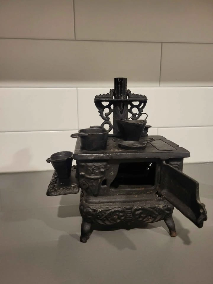 65Antique cast iron miniature stoves and accessories. Larger stove set $70 Small stove set $30 Wheelbarrow $15 Take all 3 for $100