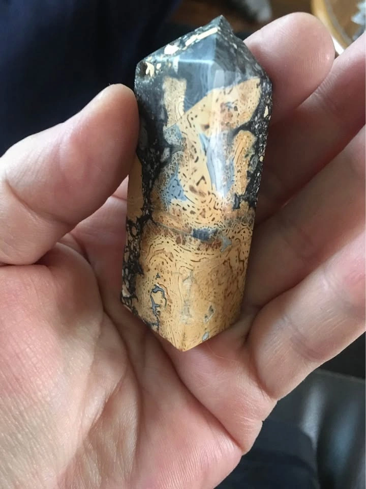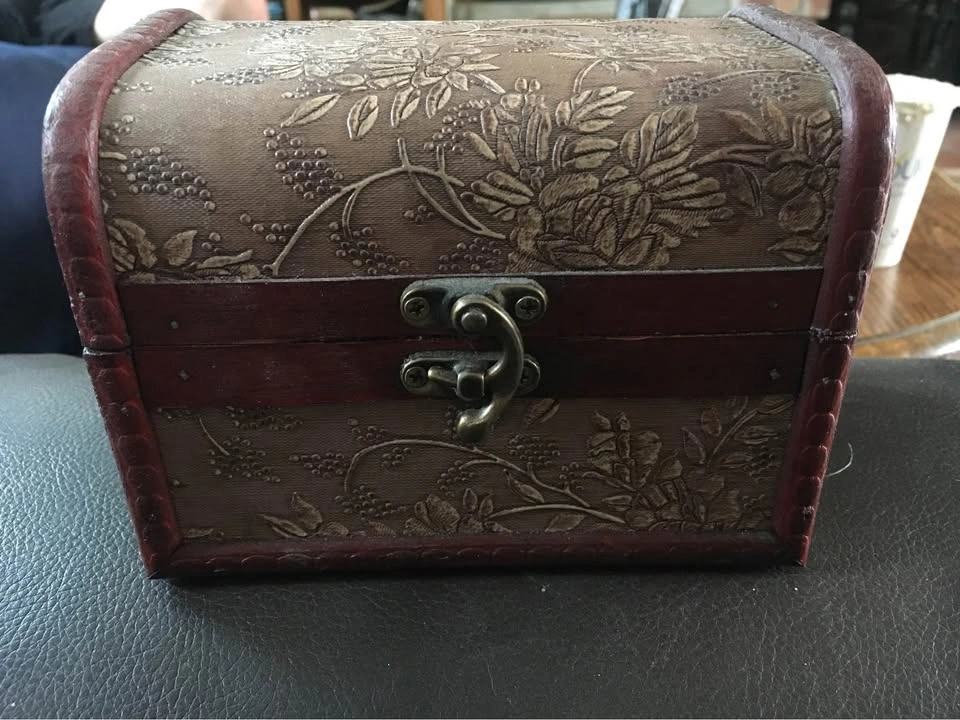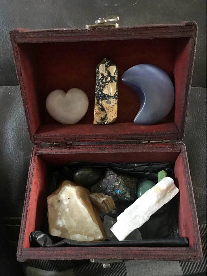 Treasure chest of mixed crystals including orange calcite, palm root tower, quartz point, blue cats eye moon, selenite stick, green adventurine tumble, peacock ore, raw tigers eye, rose quartz heart, small labradorite palm stone…etc.