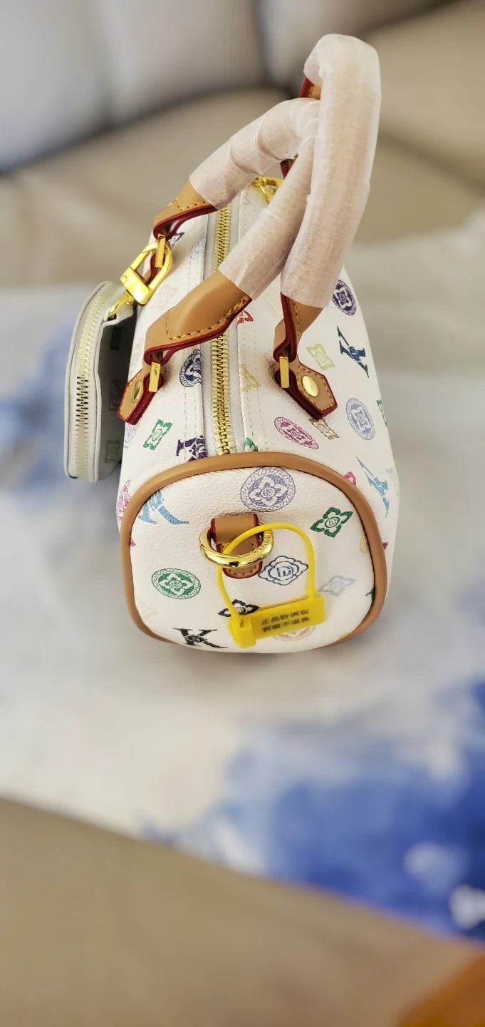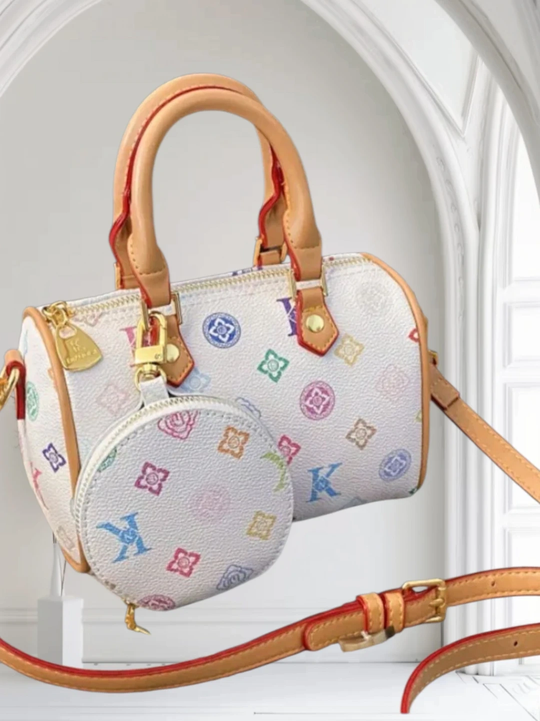 This white duffle bag is brand new and comes with a cute matching coin purse! It features a colourful design and tan handles. Perfect for adding a pop of style to your outfit!