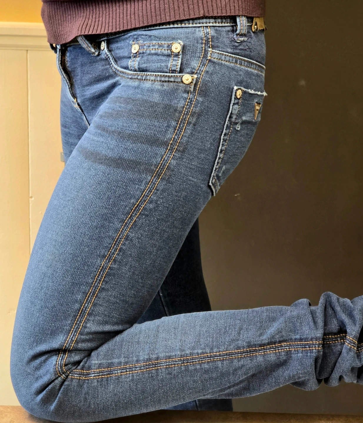 Guess blue jeans with a slim fit. These jeans are made from a comfortable stretchy material. They feature a classic five-pocket design. Perfect for everyday wear! Well taken care of and repaired with a reinforced internal patch at the crotch.