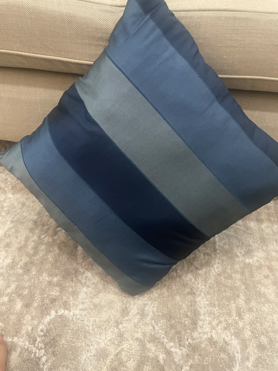 This is a decorative throw pillow with a striped design. It features shades of blue and grey. It would look great on a couch or bed!