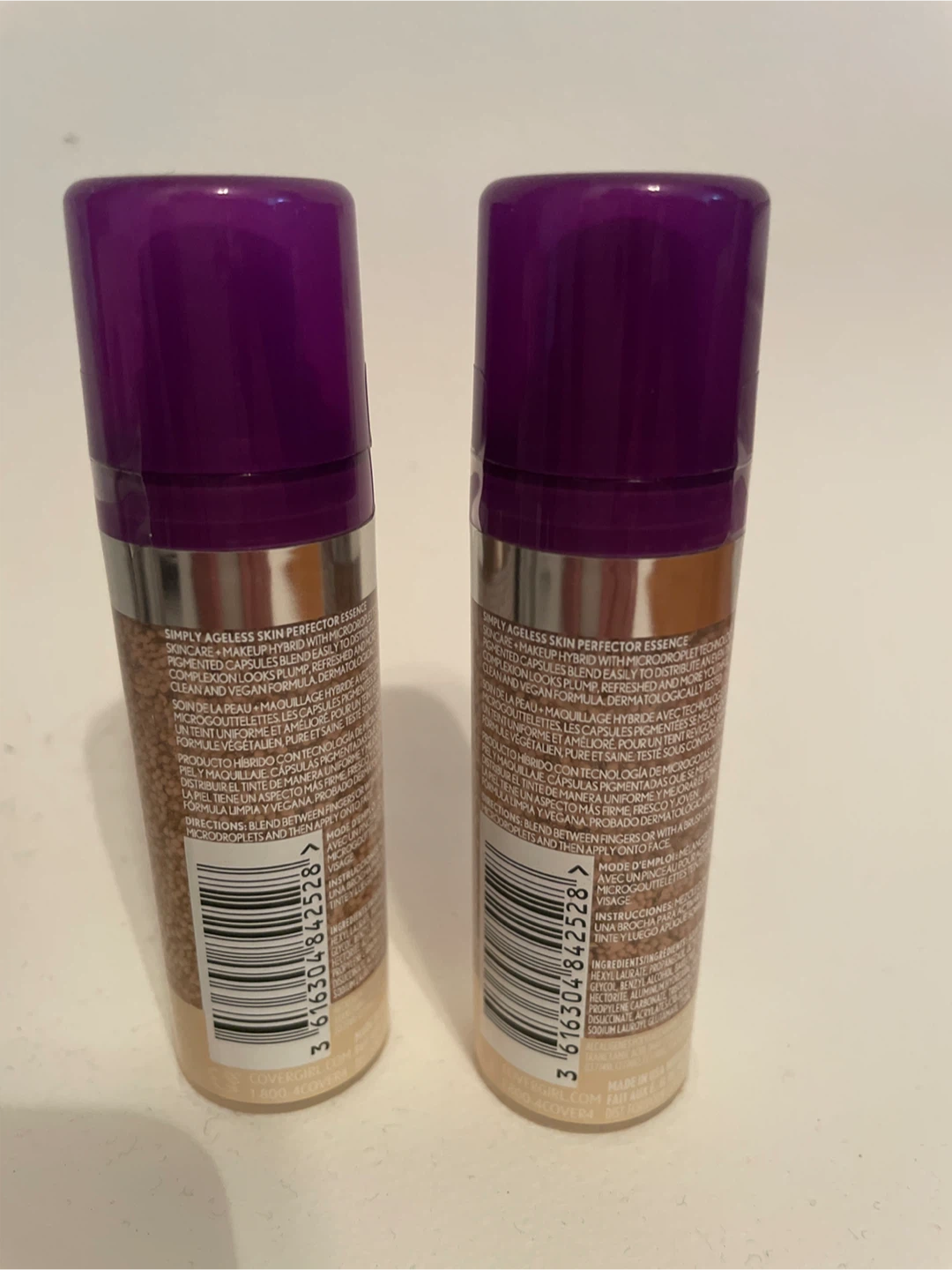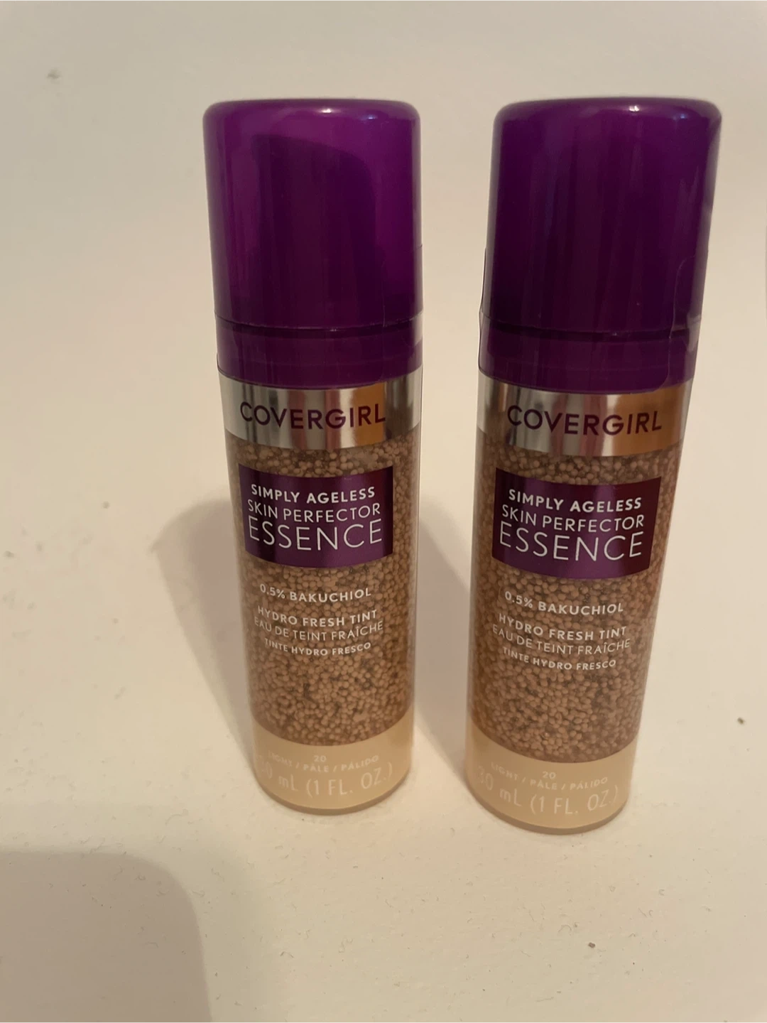 Selling two bottles of Covergirl Simply Ageless Skin Perfector Essence in the Light 20 shade. These are perfect for achieving a natural, even complexion with a touch of hydration. The formula contains 0.5% Bakuchiol and provides a hydro-fresh tint.