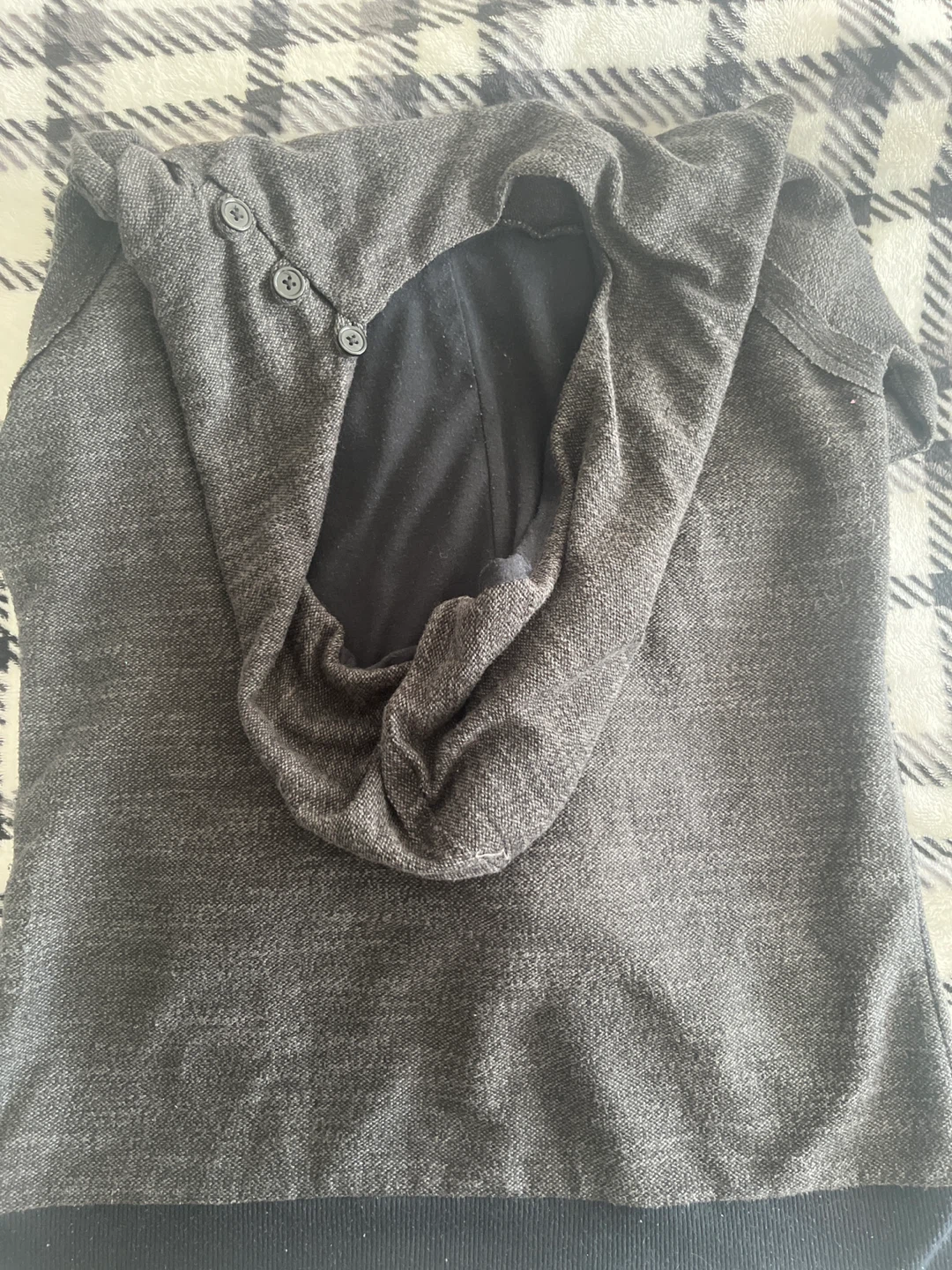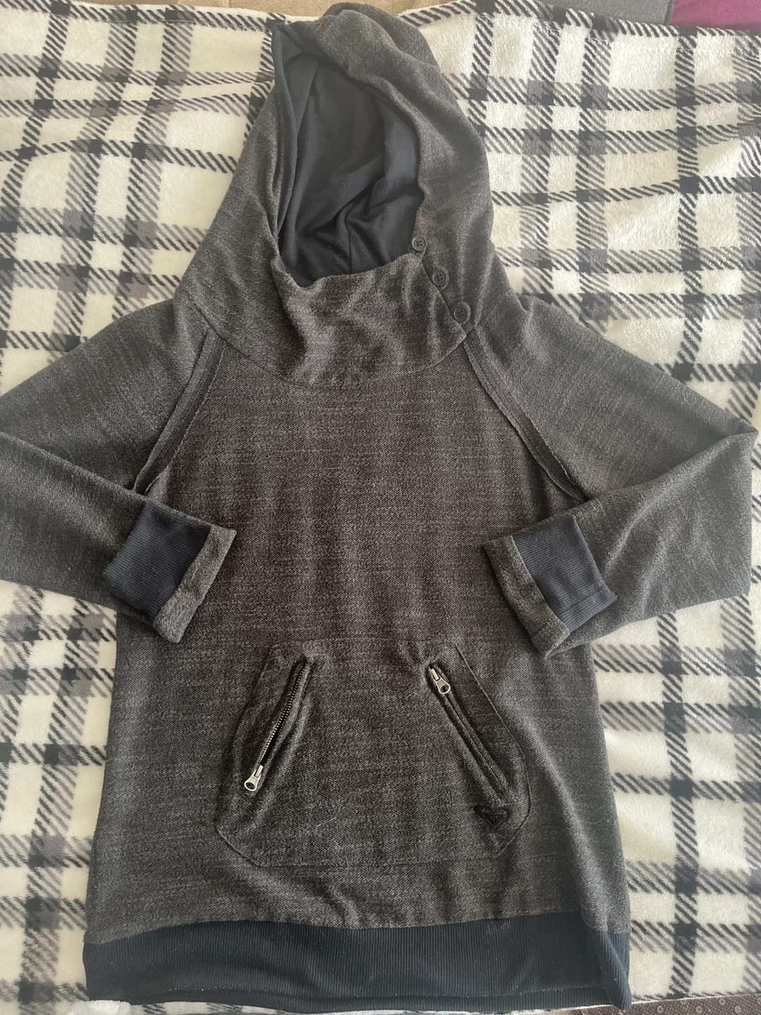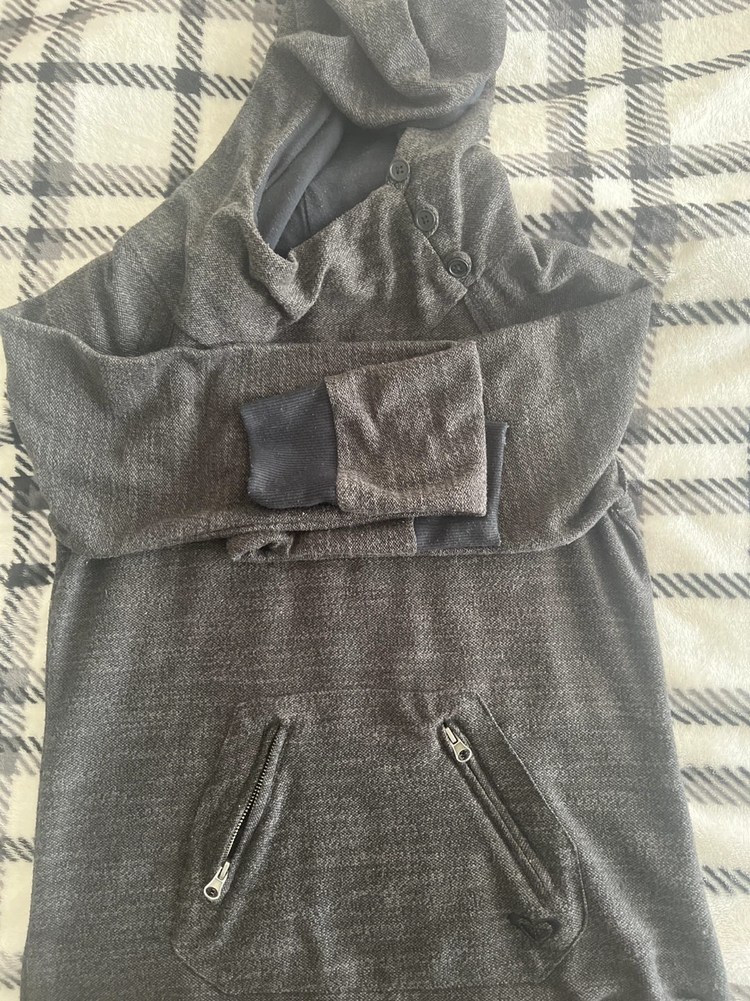 Selling a cozy charcoal grey hoodie! It features a unique button detail at the neck and convenient zippered pockets. Perfect for layering or wearing on its own on cooler days. It's in great condition and ready for a new home pet and smoke free 🏠