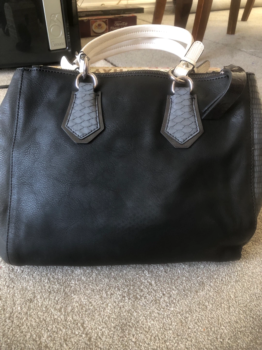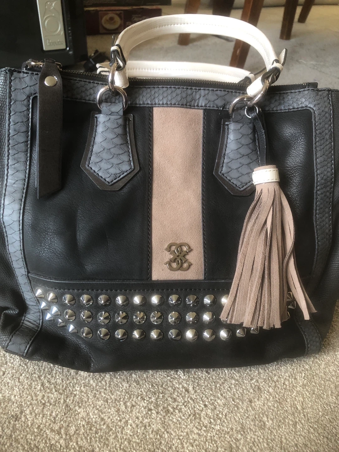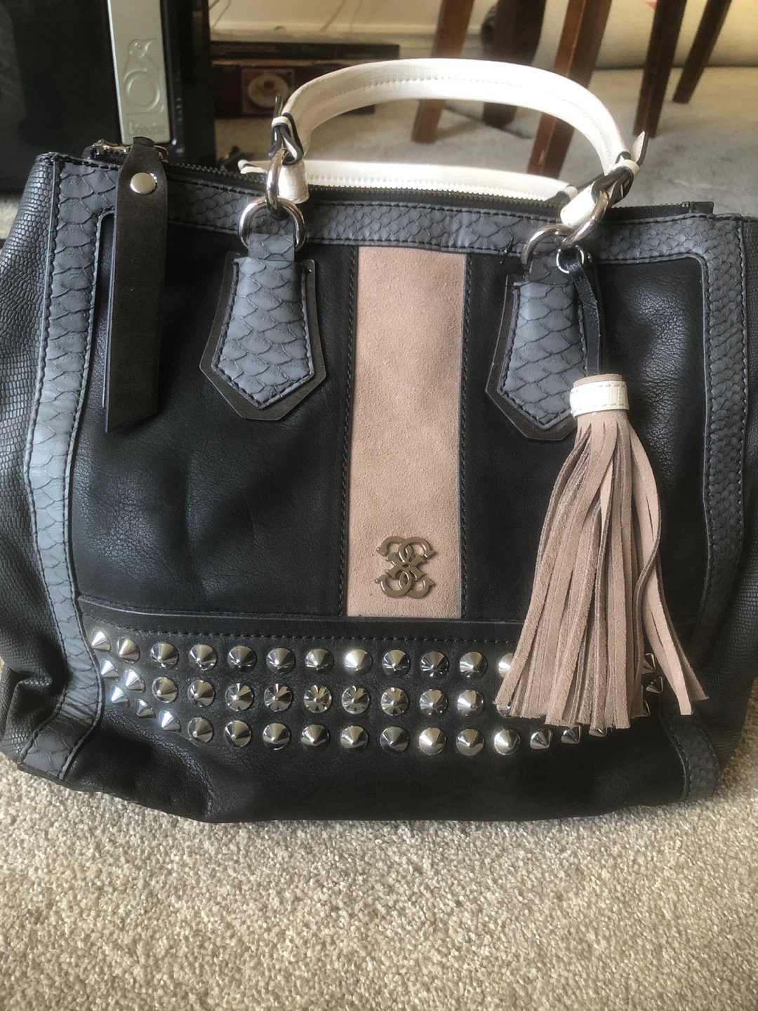 Selling a black Guess tote bag. It features a unique design with studded accents and a tassel. The bag has a combination of textures, including a snakeskin-like trim and a suede-like panel. Perfect for everyday use!