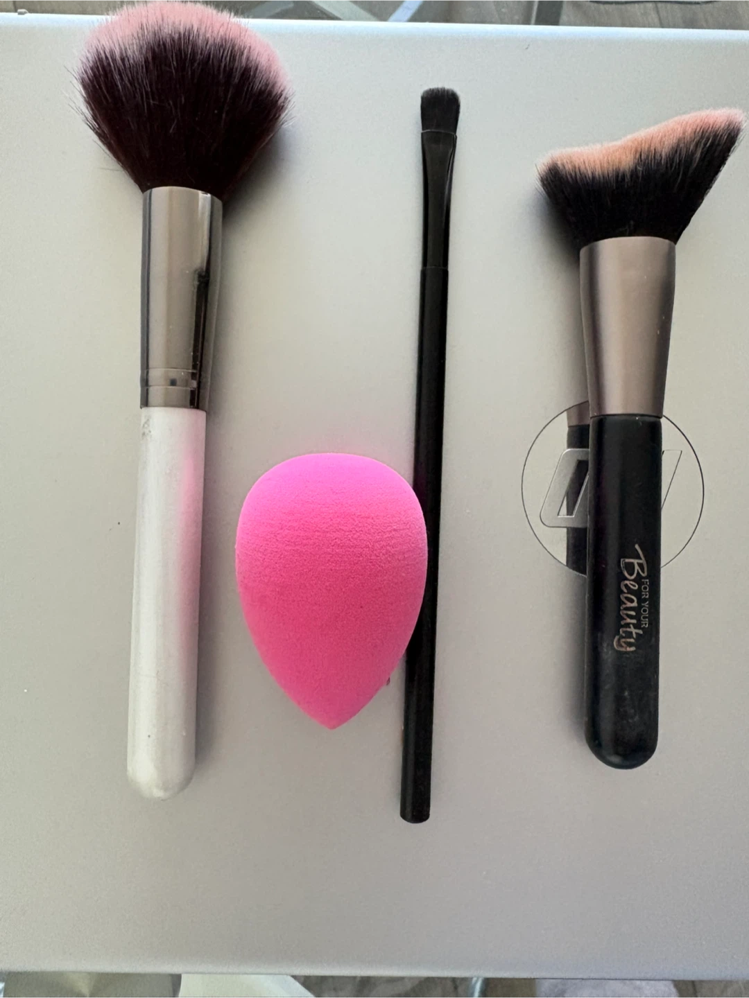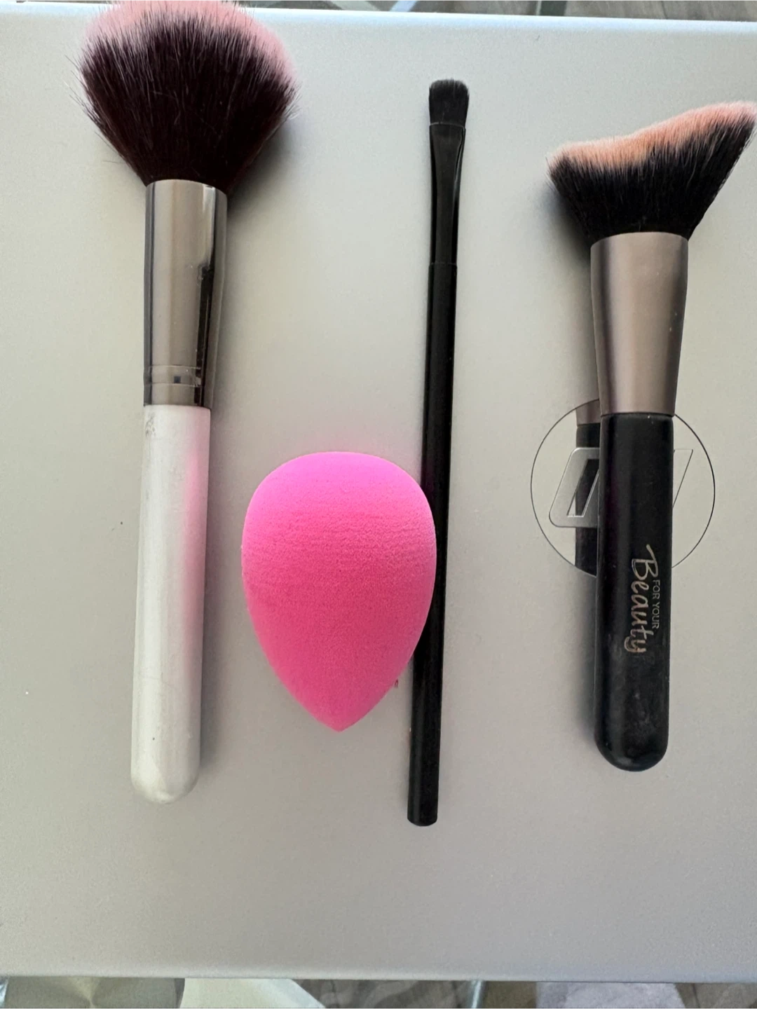 Selling a set of makeup brushes. Includes a powder brush, angled brush, eyeshadow brush, and a makeup sponge. Perfect for all your makeup needs never used