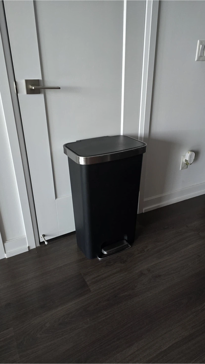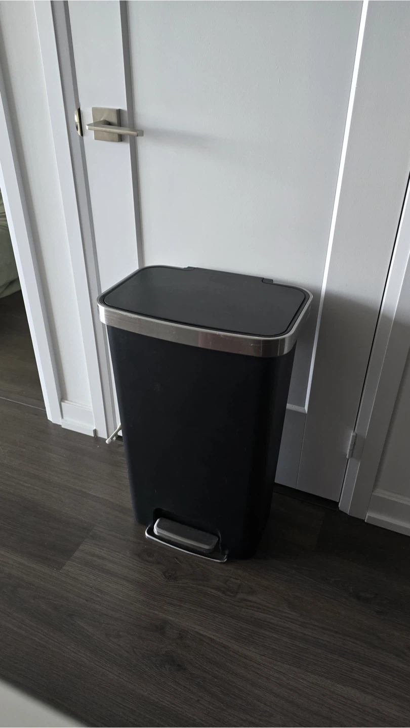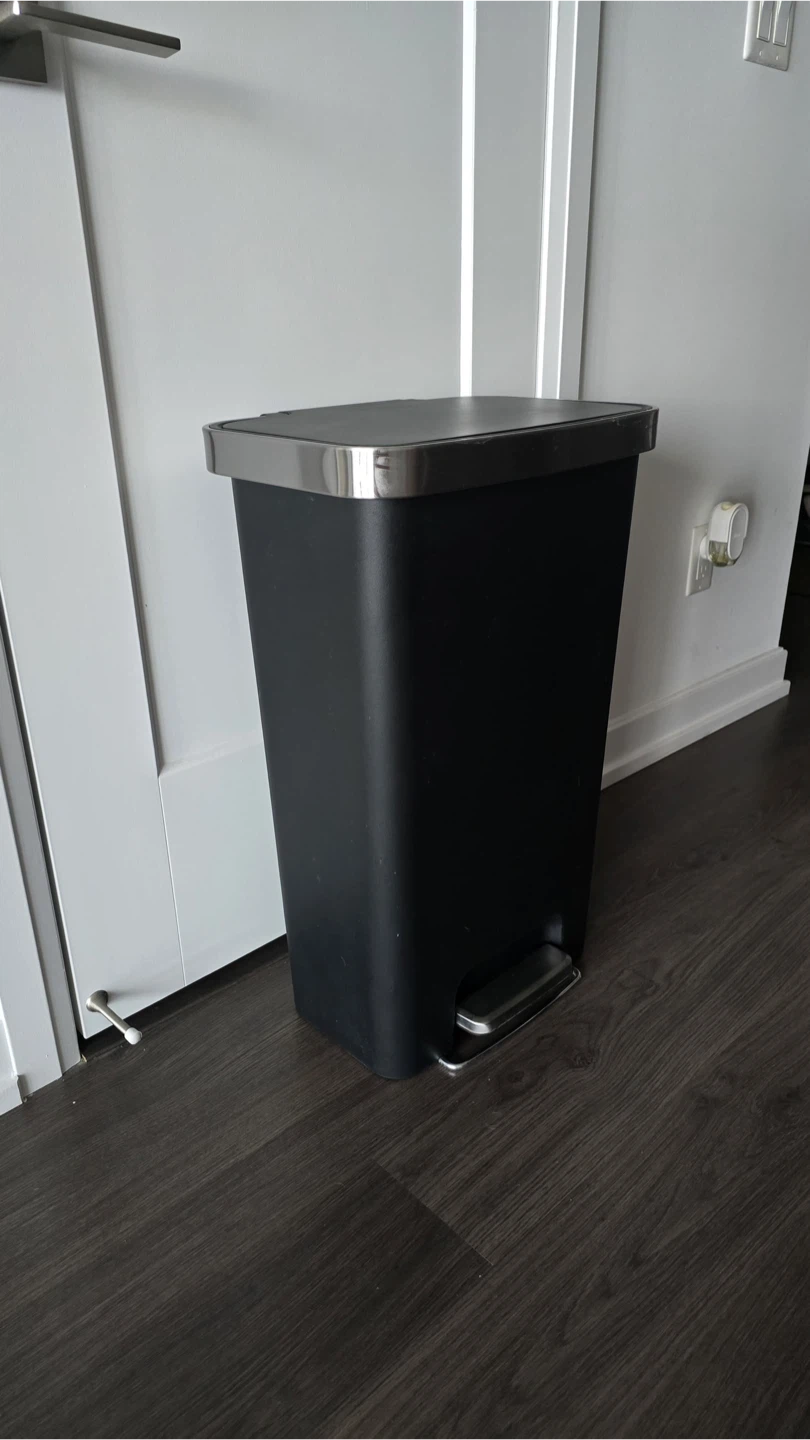 Selling a 45L black trash can with a chrome-trimmed lid and a foot pedal for hands-free operation. This step bin is made in durable plastic construction. It is slim, for fitting in tight spaces.