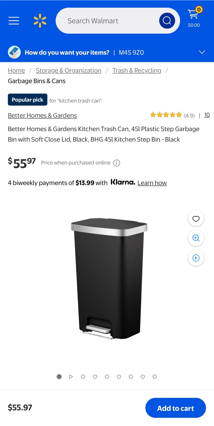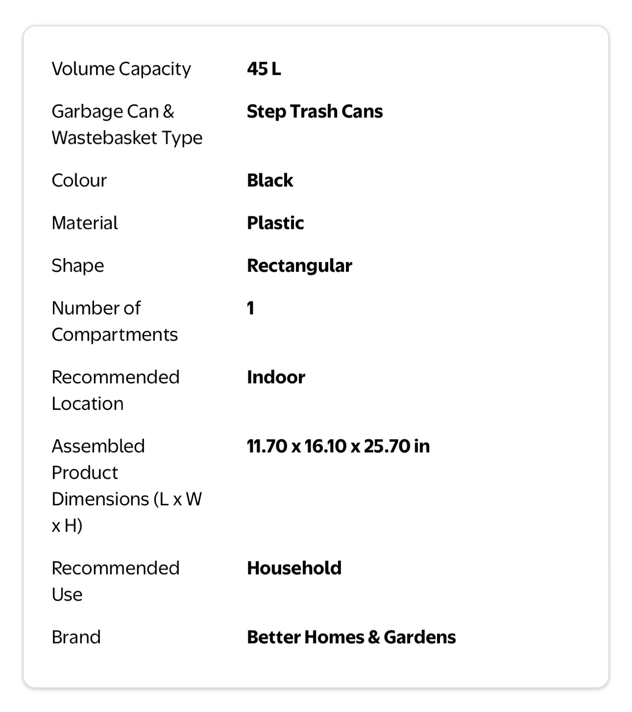 45 liters (approximately 11.9 gallons), with soft-close lid, stay-open function, and a plastic bag fixer to keep the bag in place.