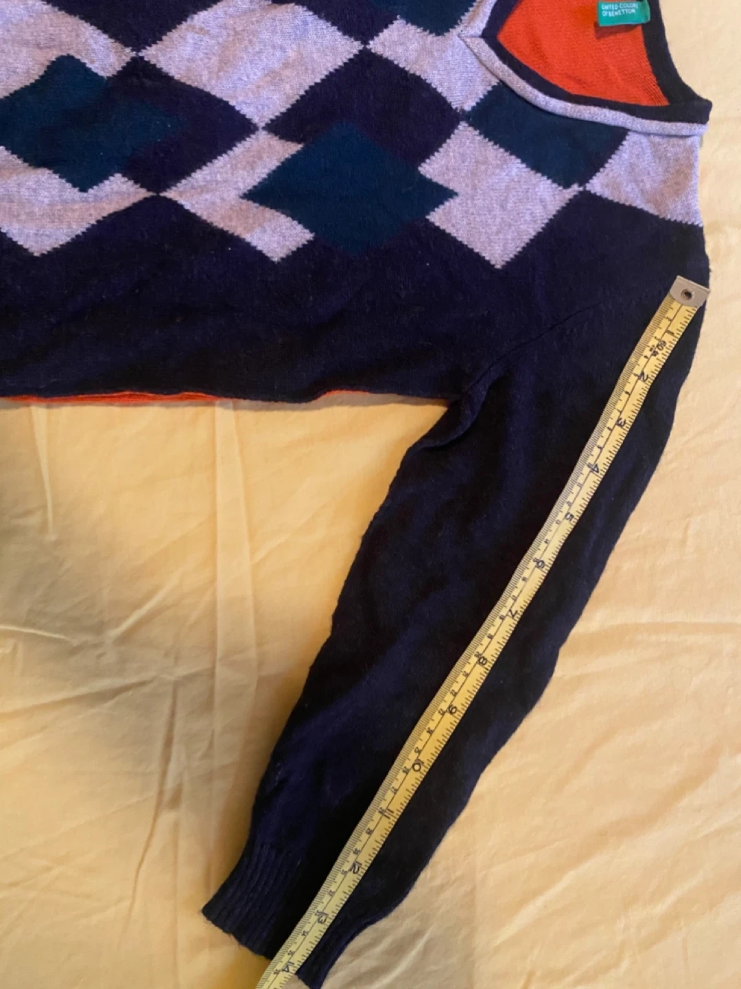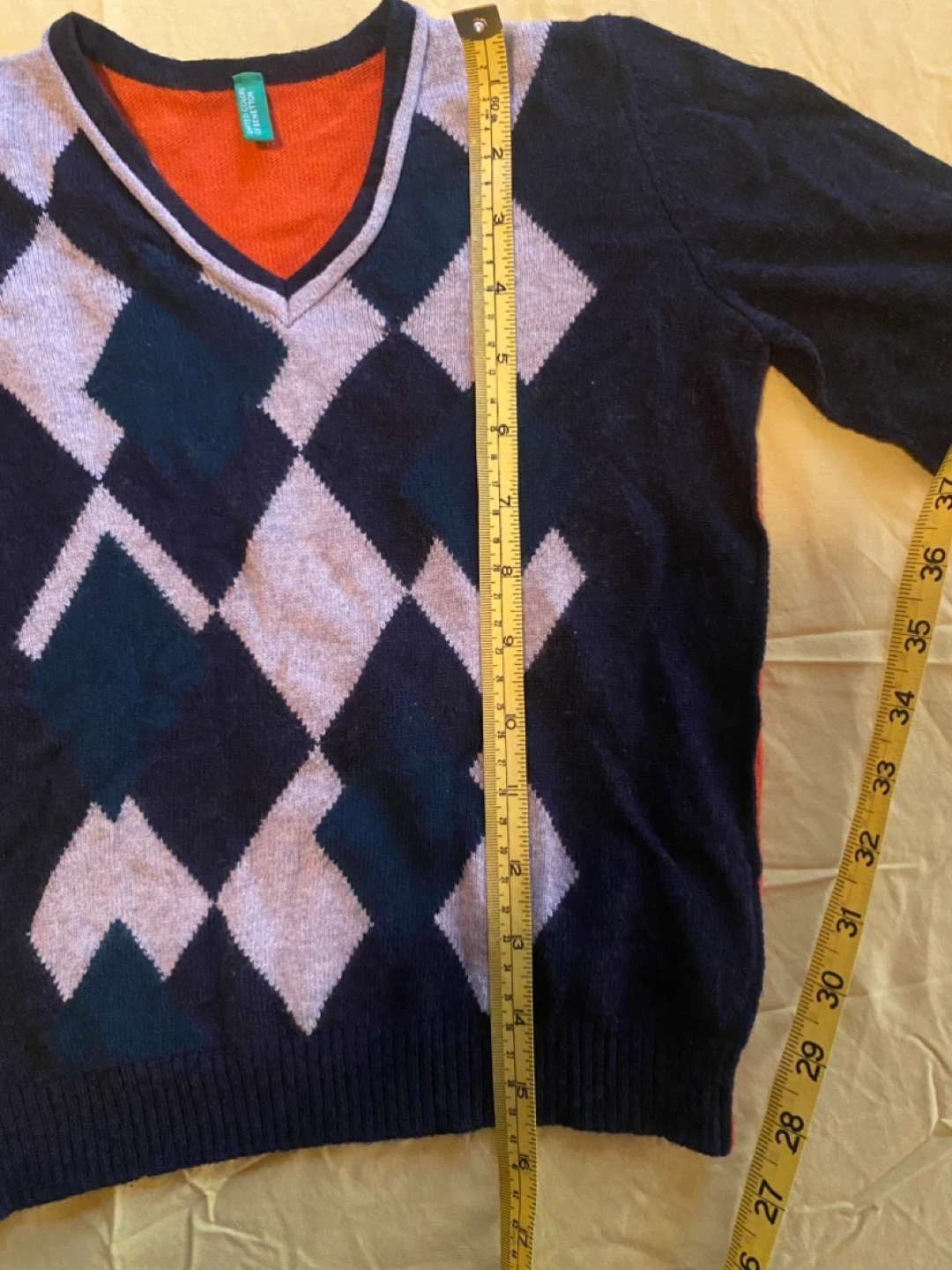 10Cozy United Colors of Benetton sweater with a classic argyle pattern! It's a size XXS 3-4 years old and is a wool blend. Like new, washed but never worn.