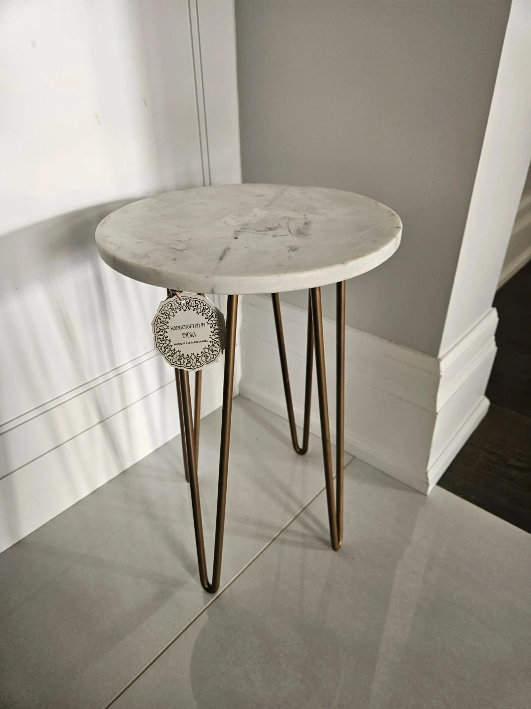 Selling a lovely side table handcrafted in India. It features a marble top and sleek metal legs, perfect for adding a touch of elegance to any room