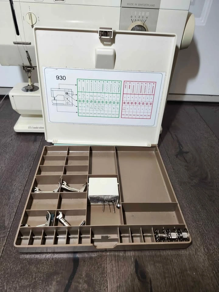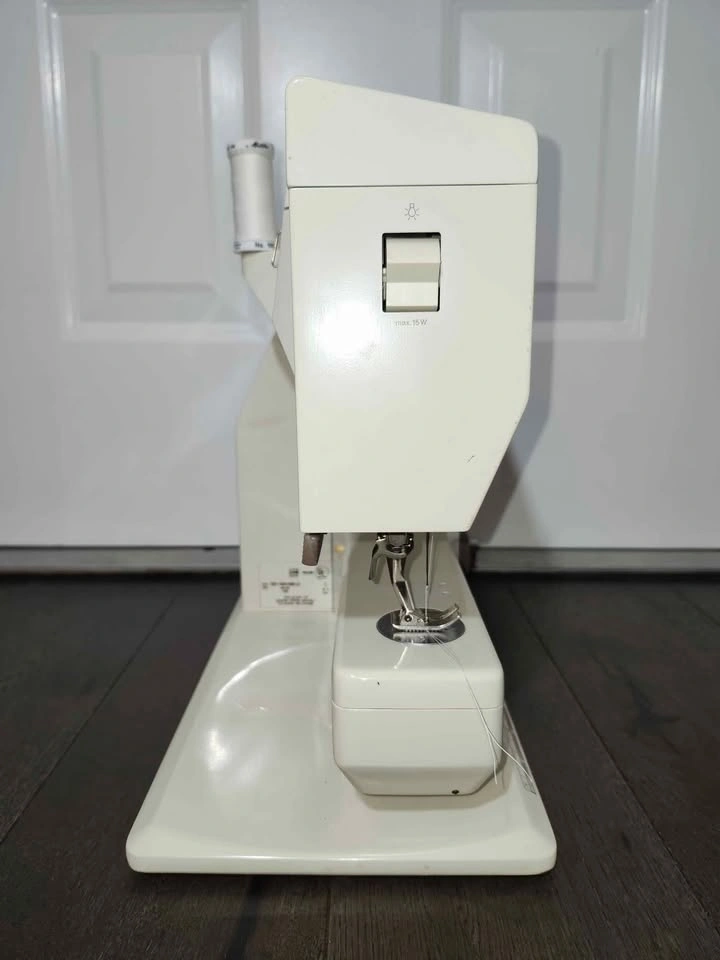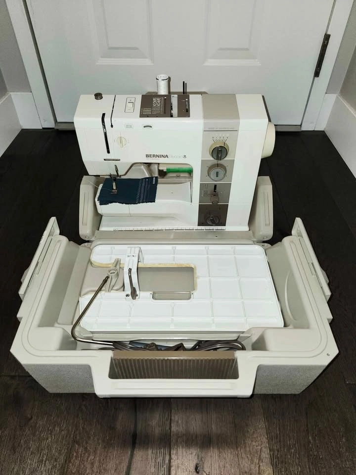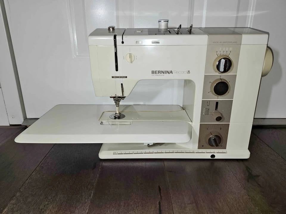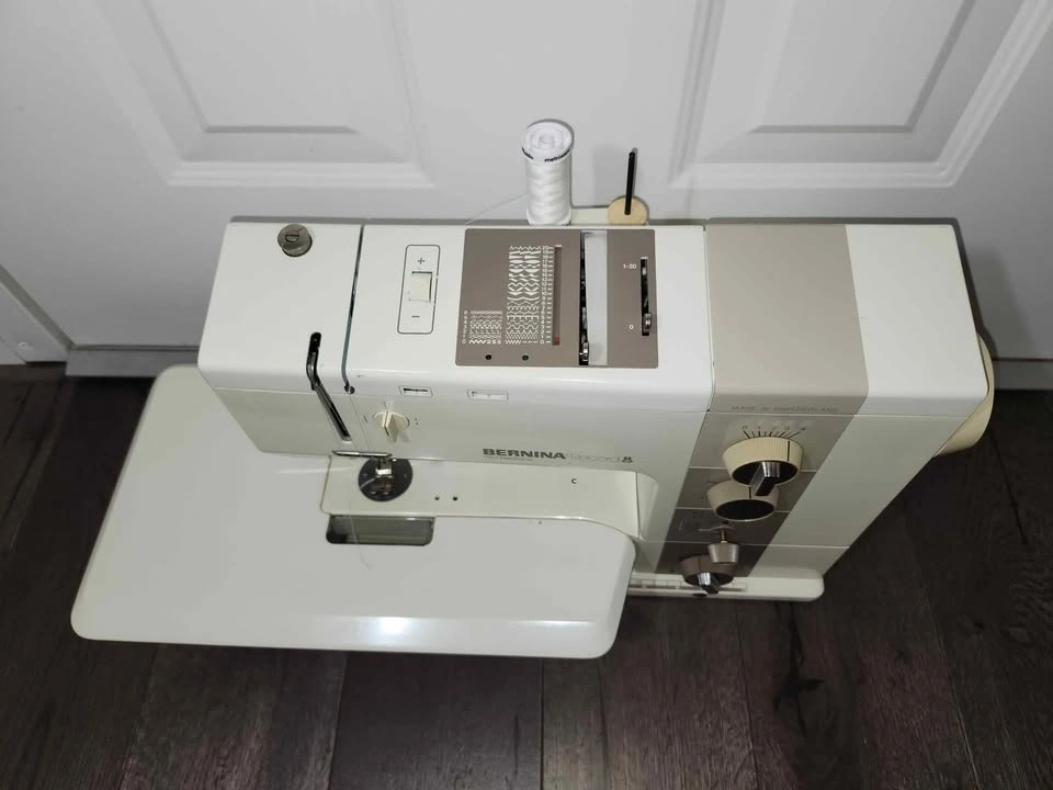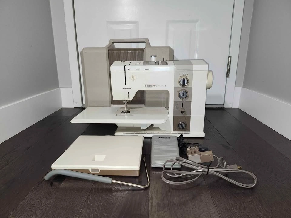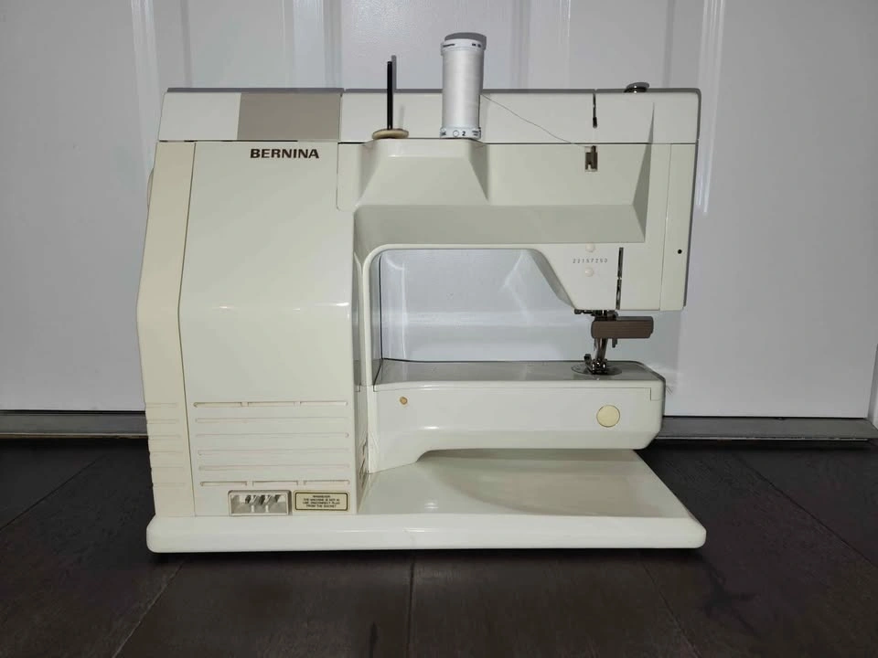 10Highly desirable machine in good condition and it makes great stitches! Has needle up function, 30 stitches (including embroidery, stretch, basting and buttonhole function). Also has 2 settings for motor speed. Made in Switzerland. Comes with everything pictured: carrying case, removable table, foot pedal, power cord, knee lift, accessory case (with 1 broken hinge), 5 presser feet, 4 bobbins and a few accessories. Refurbished by themachineguy.ca including cleaned, oiled, adjusted, refurbished electronics, new LED bulb, new foot pedal and new needle. The user manual can be emailed if desired. This is a rare machine in this area and arguably one of the best Berninas ever made! Comes with a 30 day warranty!