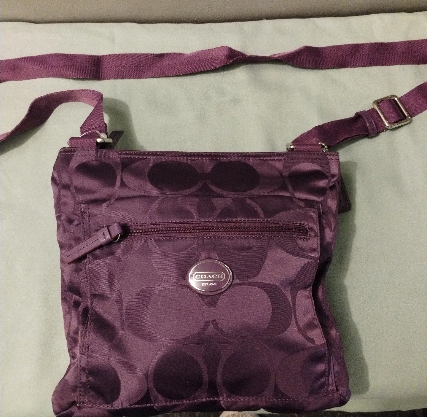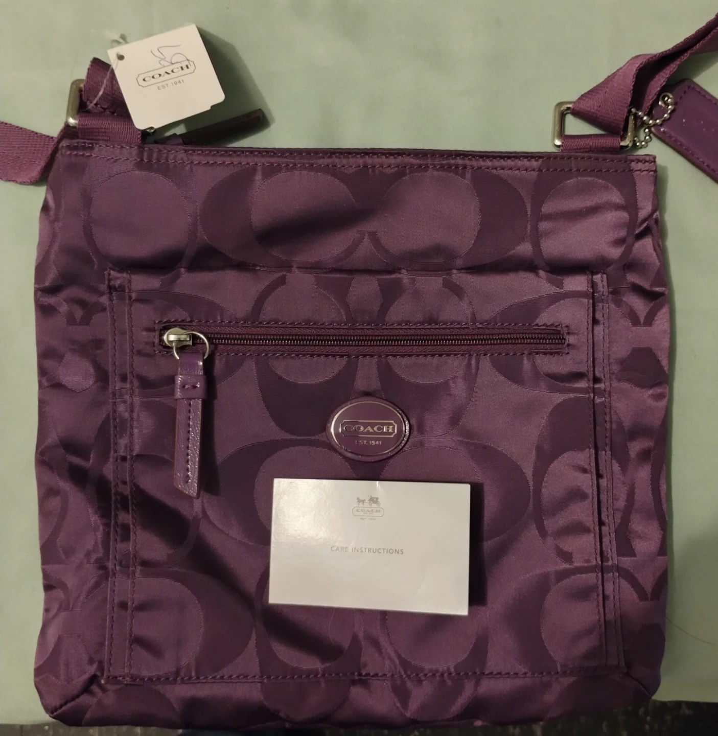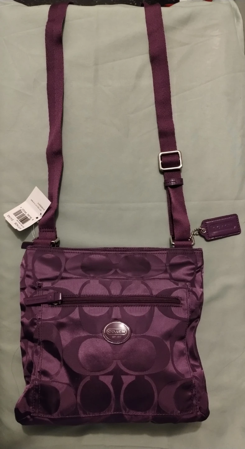 This is a Coach crossbody bag in a lovely shade of purple! It's perfect for carrying your essentials while keeping your hands free. The bag features the classic Coach logo pattern and has a convenient front zipper pocket. It's brand new with tags and ready for a new home