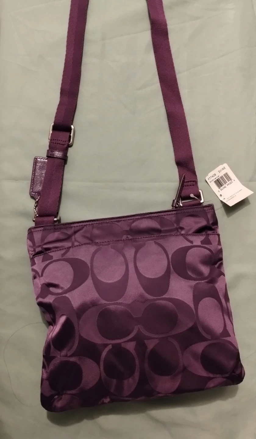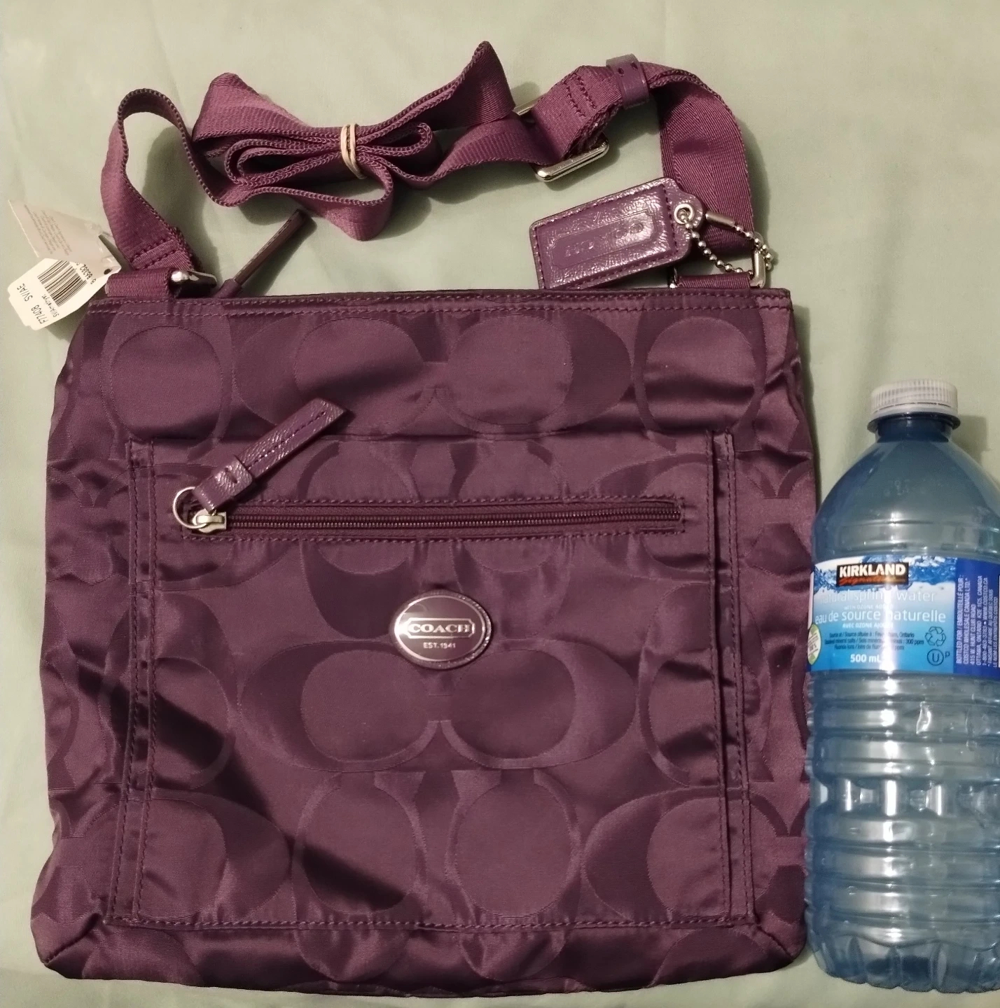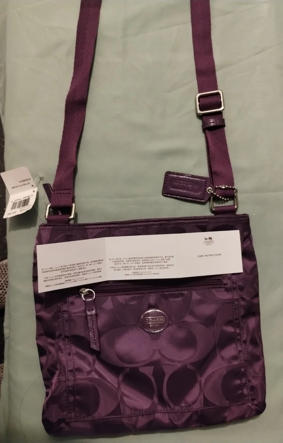 This is a Coach crossbody bag in a lovely shade of purple! It's perfect for carrying your essentials while keeping your hands free. The bag features the classic Coach logo pattern and has a convenient front zipper pocket. It's brand new with tags and ready for a new home