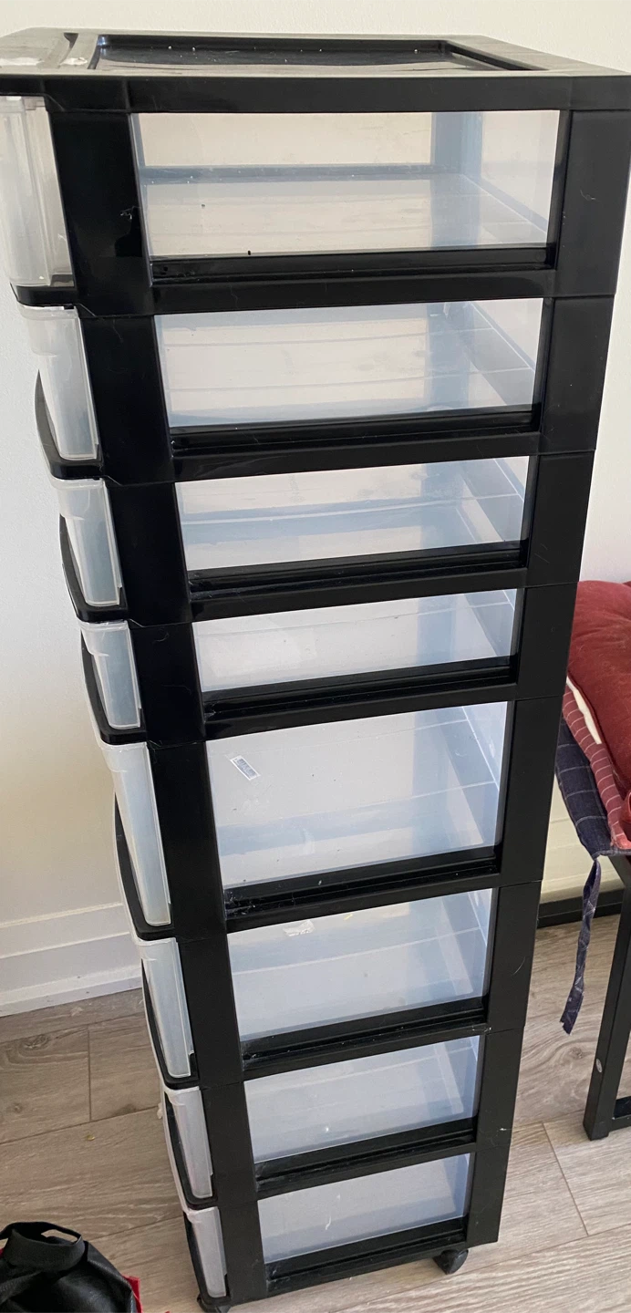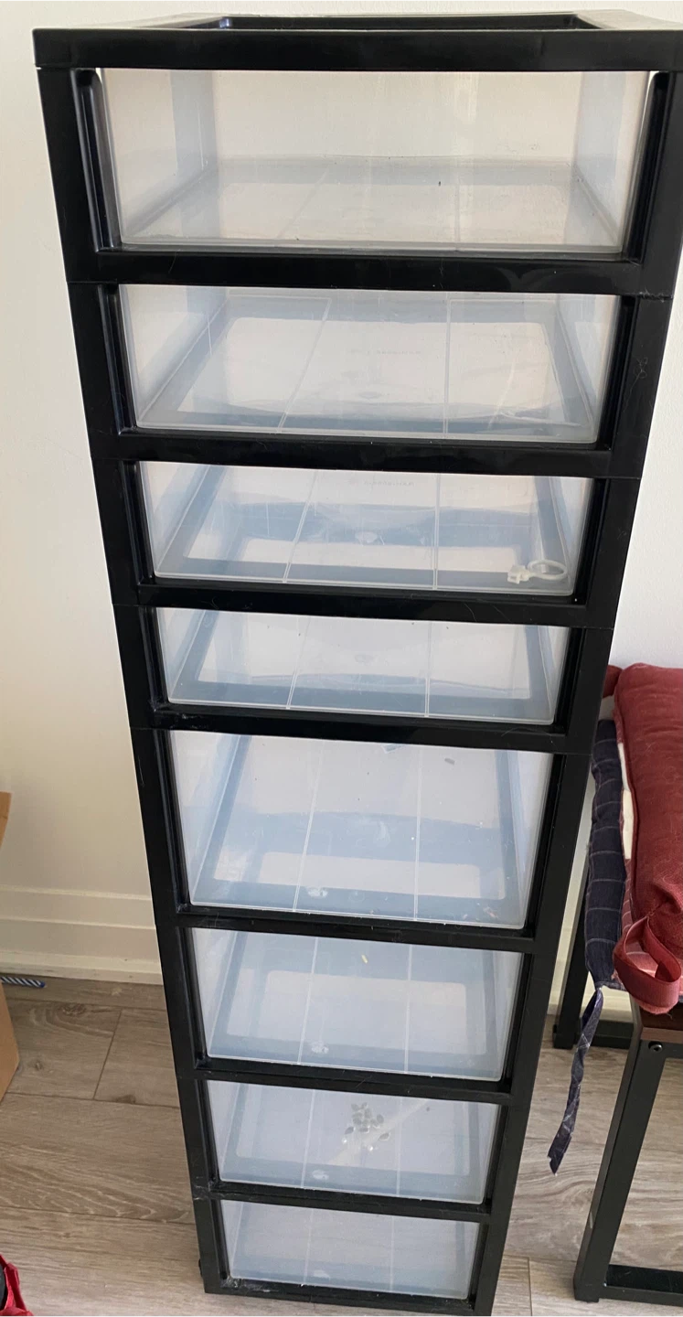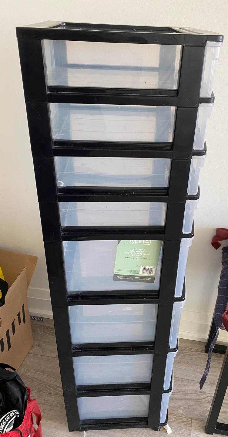 Selling a Type A 8-drawer rolling storage cart. It's great for organizing various items around the house. The cart is black and has clear drawers, making it easy to see what's inside. It's in good condition and ready for a new home!