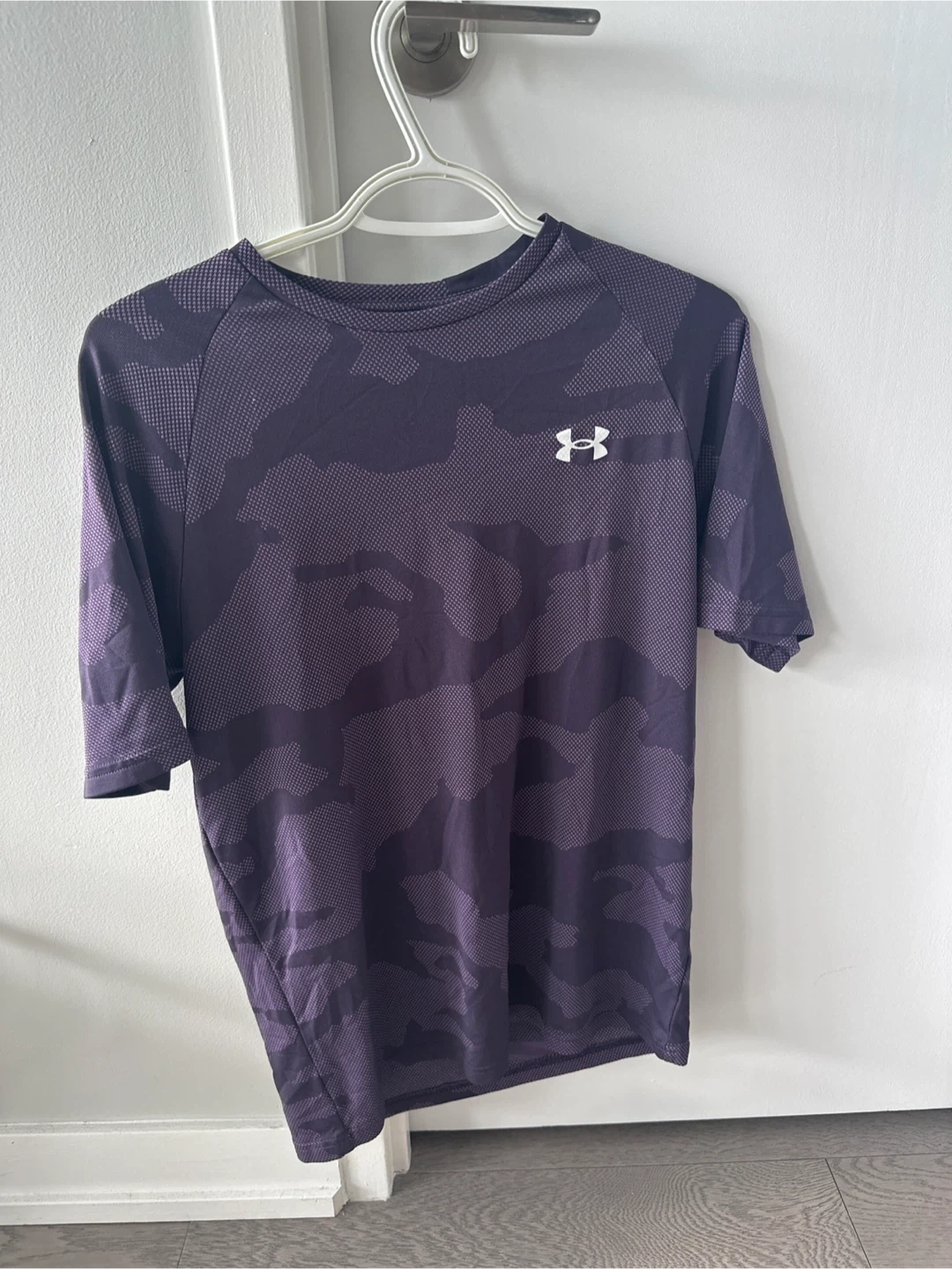 Selling a purple camo t-shirt from Under Armour. It's in great condition and perfect for workouts or casual wear. The material is lightweight and breathable, making it super comfy.