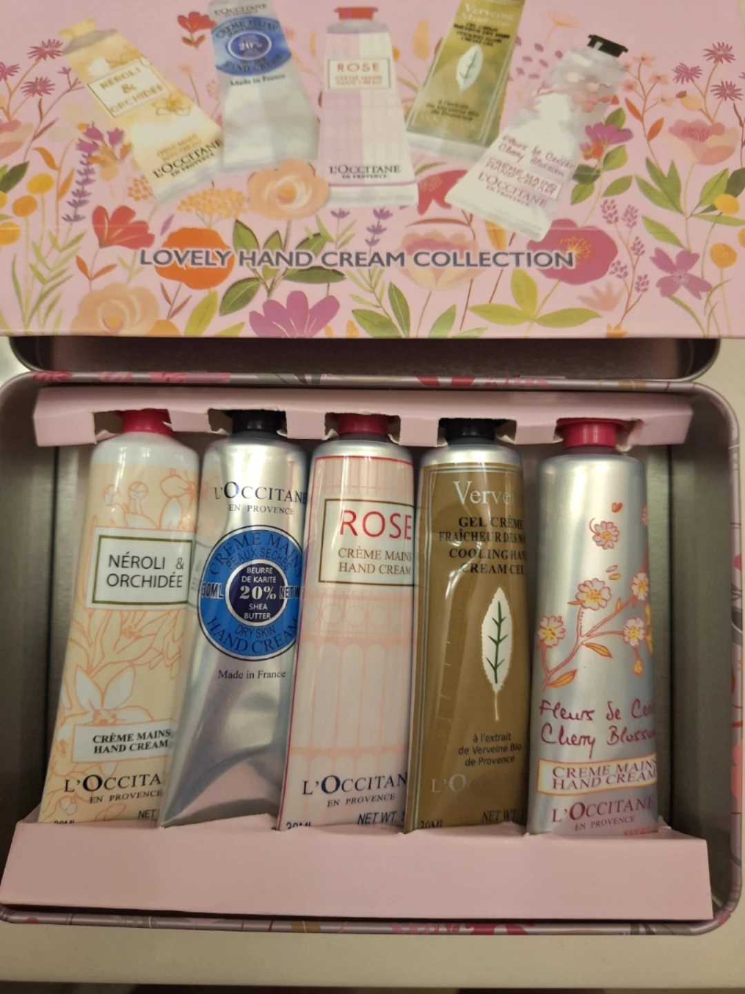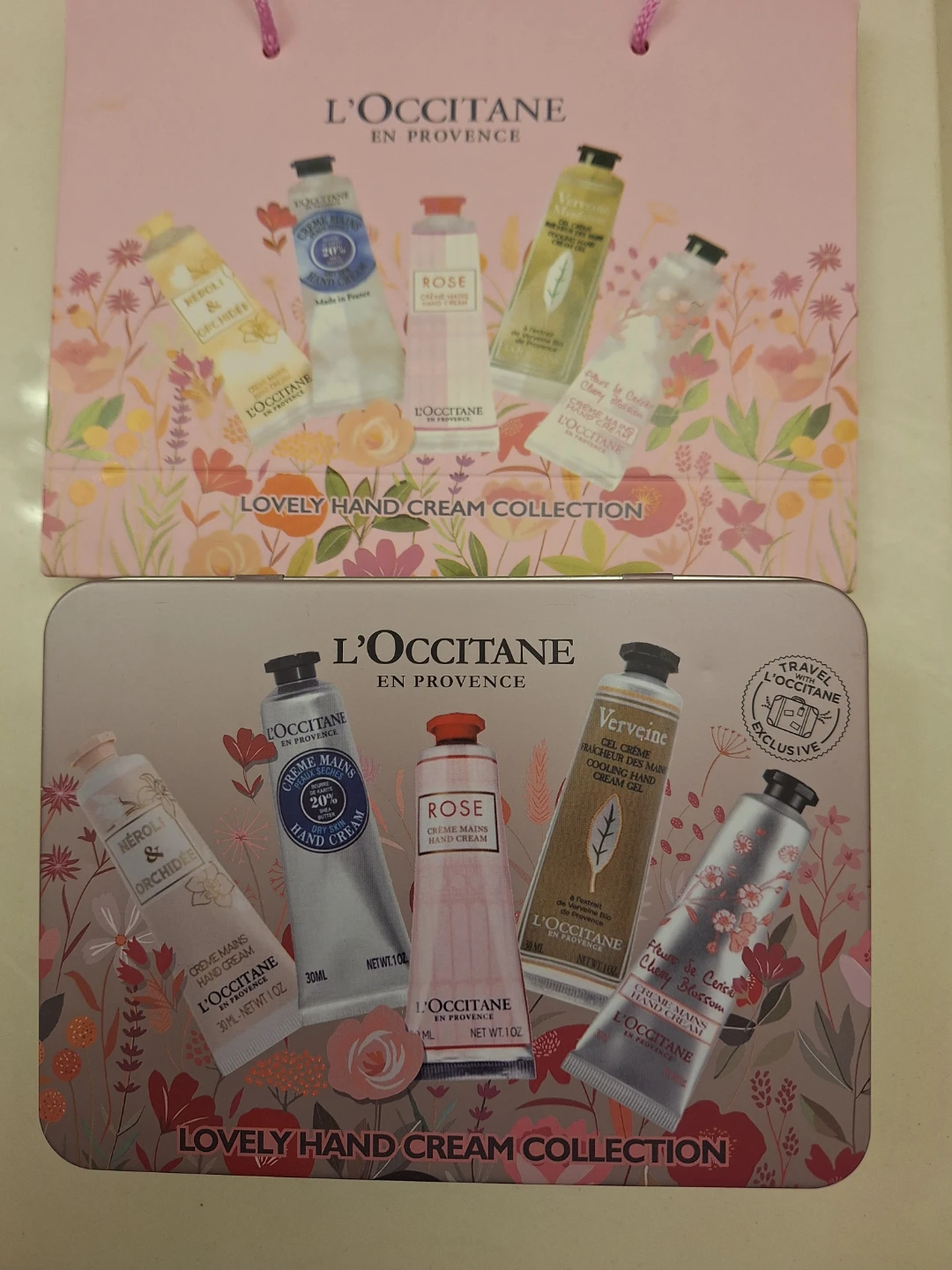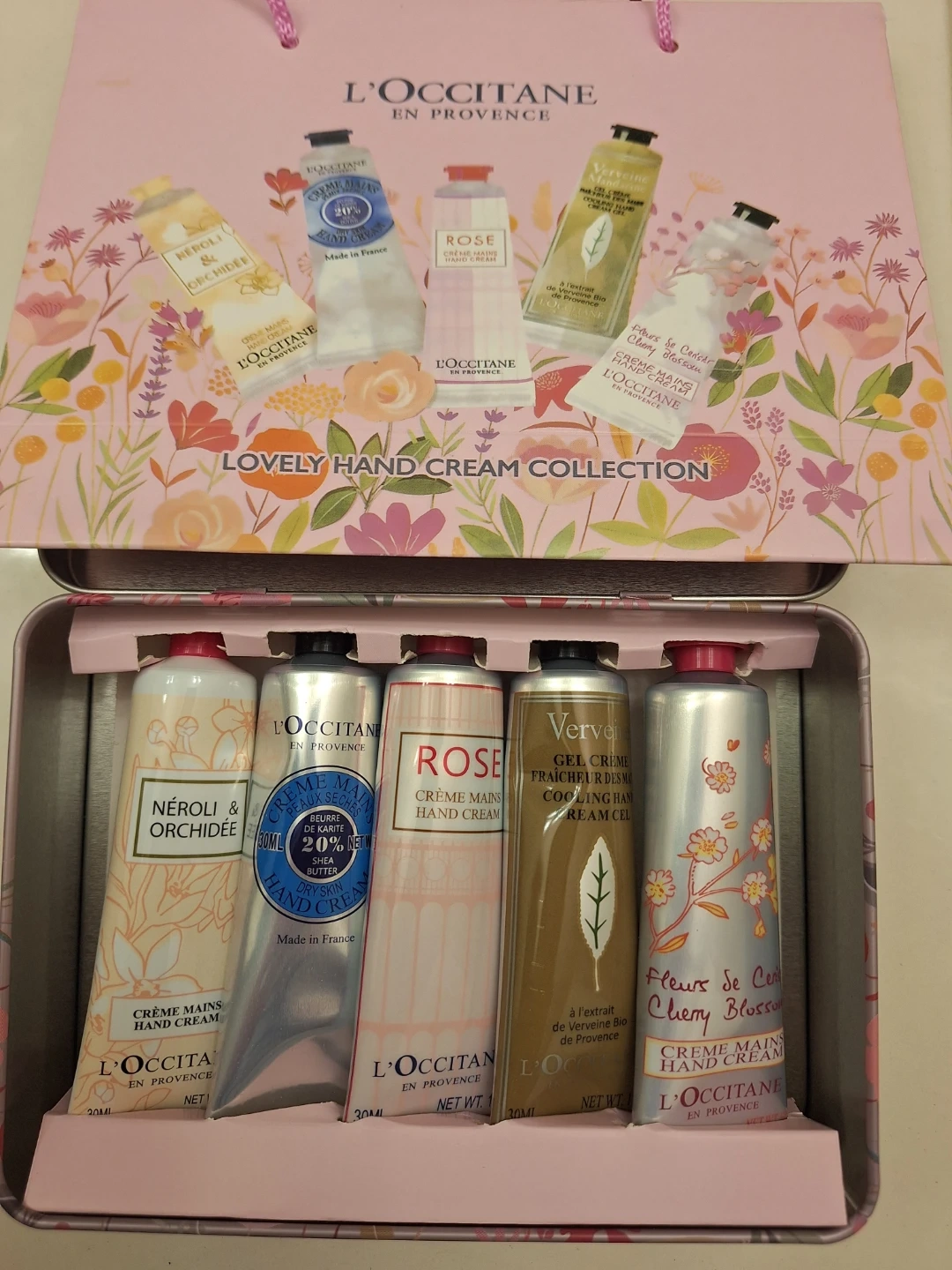 Brand new L'Occitane Hand Cream Collection. 5 tube of 30g hand creams: Rose, Shea Butter, Verbena, Cherry Blossom, and Neroli & Orchidee. Comes in a nice tin box and matching gift bag.