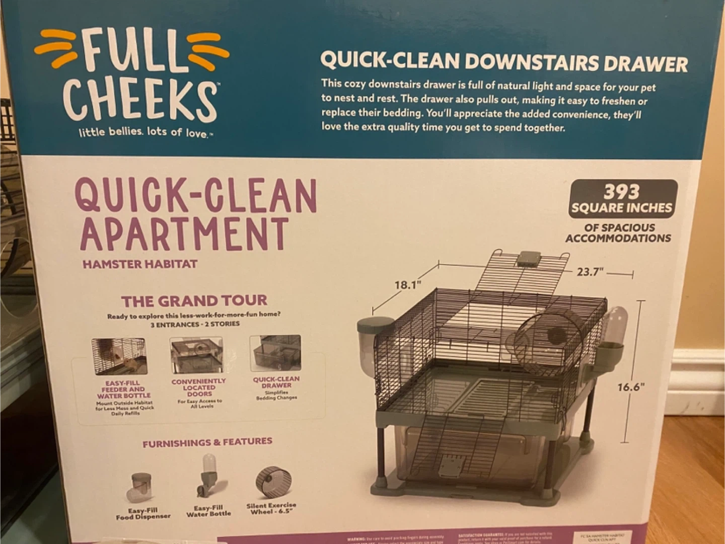 Selling a Full Cheeks Quick-Clean Apartment hamster habitat! It features a quick-clean downstairs drawer, making it easy to keep your little friend's home tidy. It includes an easy-fill food dispenser and water bottle, plus a silent 6.3" exercise wheel. The habitat offers 393 square inches of spacious accommodations for your hamster to explore Self picking only