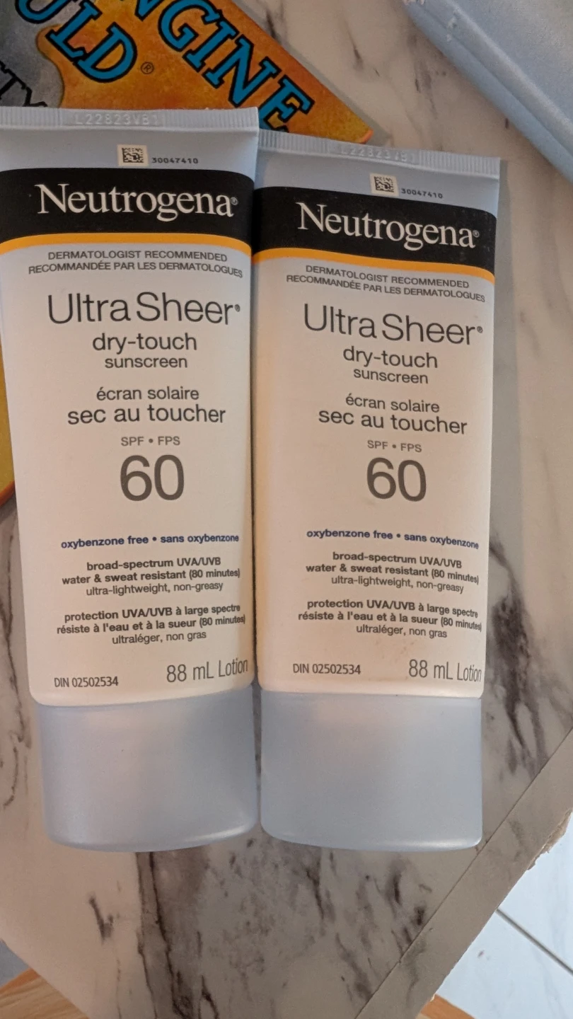 two tubes of Neutrogena Ultra Sheer dry-touch sunscreen with SPF 60. They're broad spectrum UVA/UVB, water and sweat resistant for 80 minutes, and ultra-lightweight and non-greasy. The expiration date is July 2025