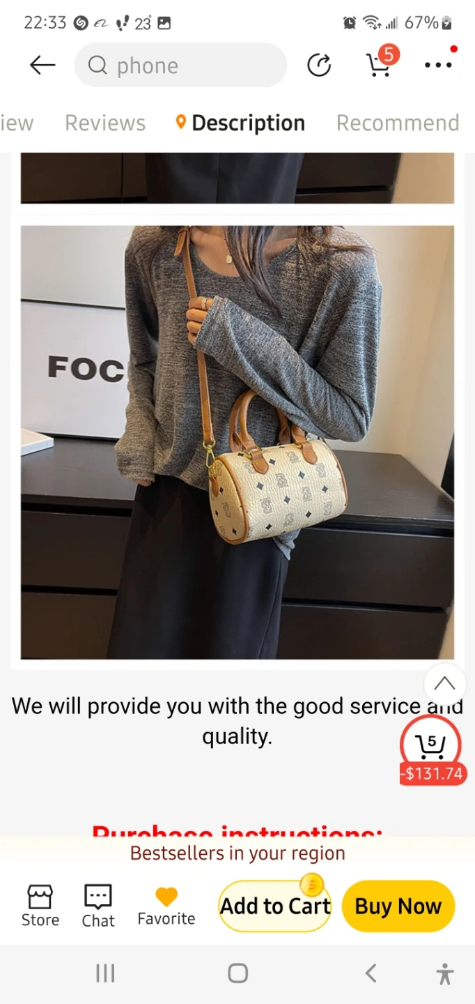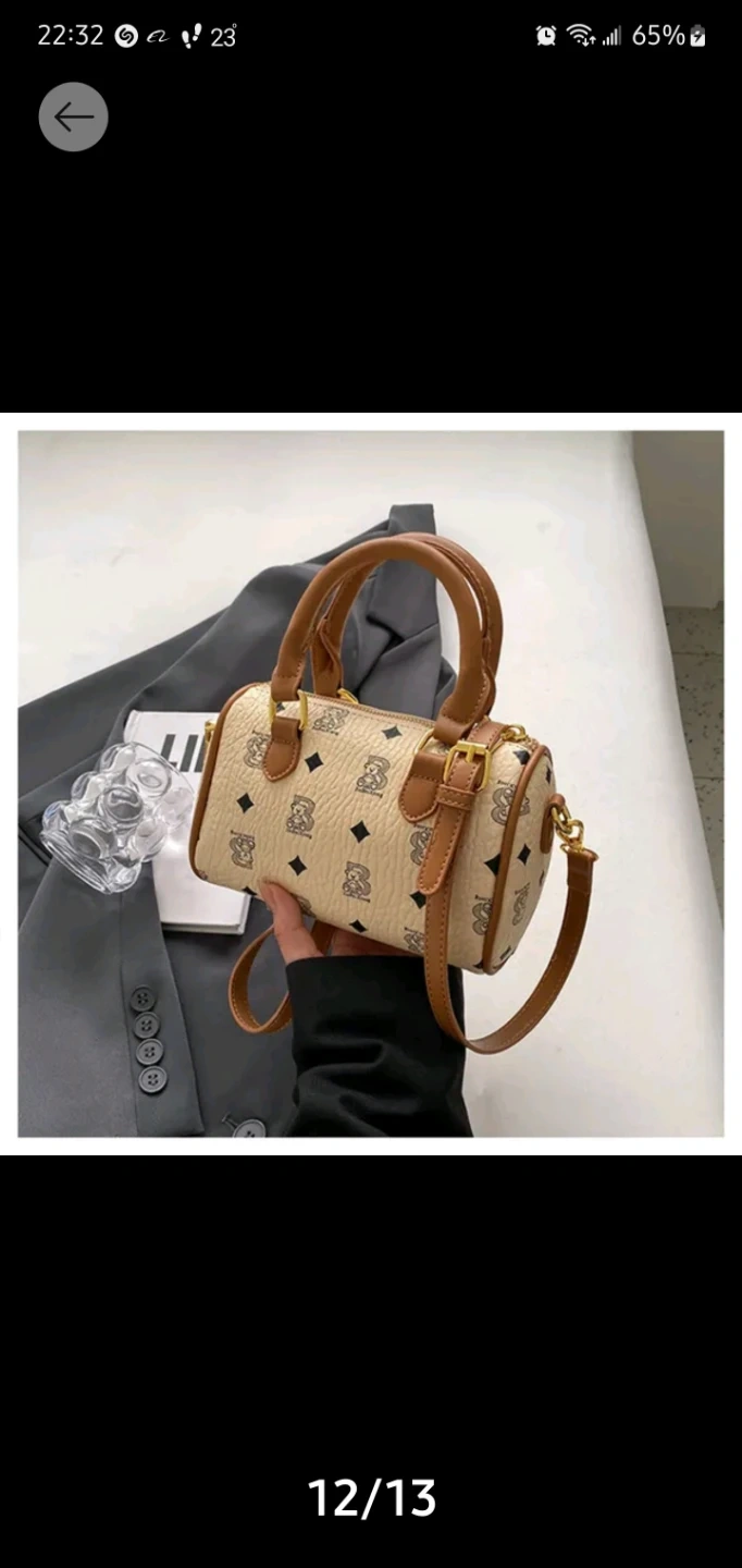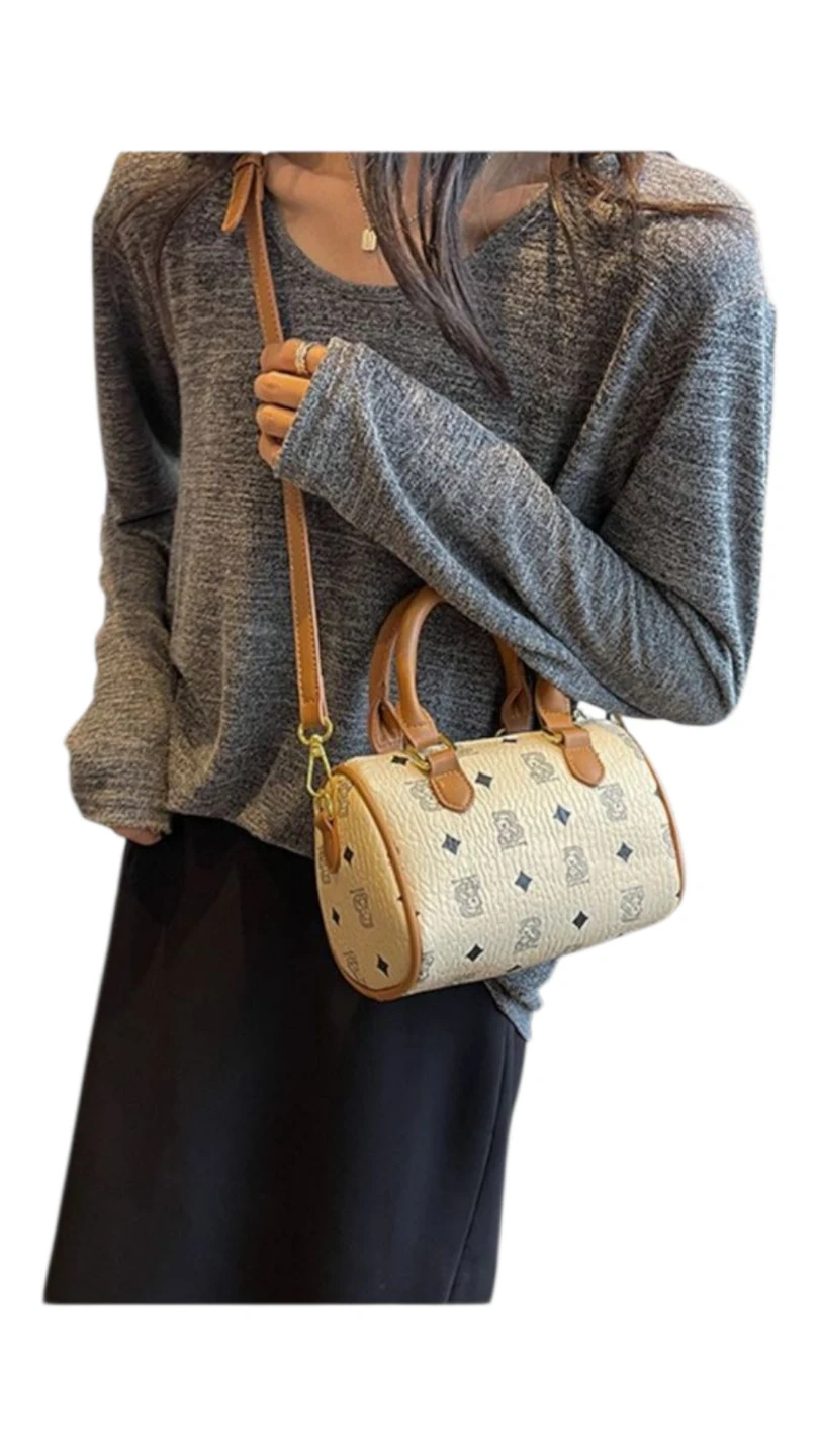 This is a cute barrel-shaped handbag with a unique pattern and brown accents. It comes with a strap for easy carrying. Perfect for adding a touch of style to any outfit!