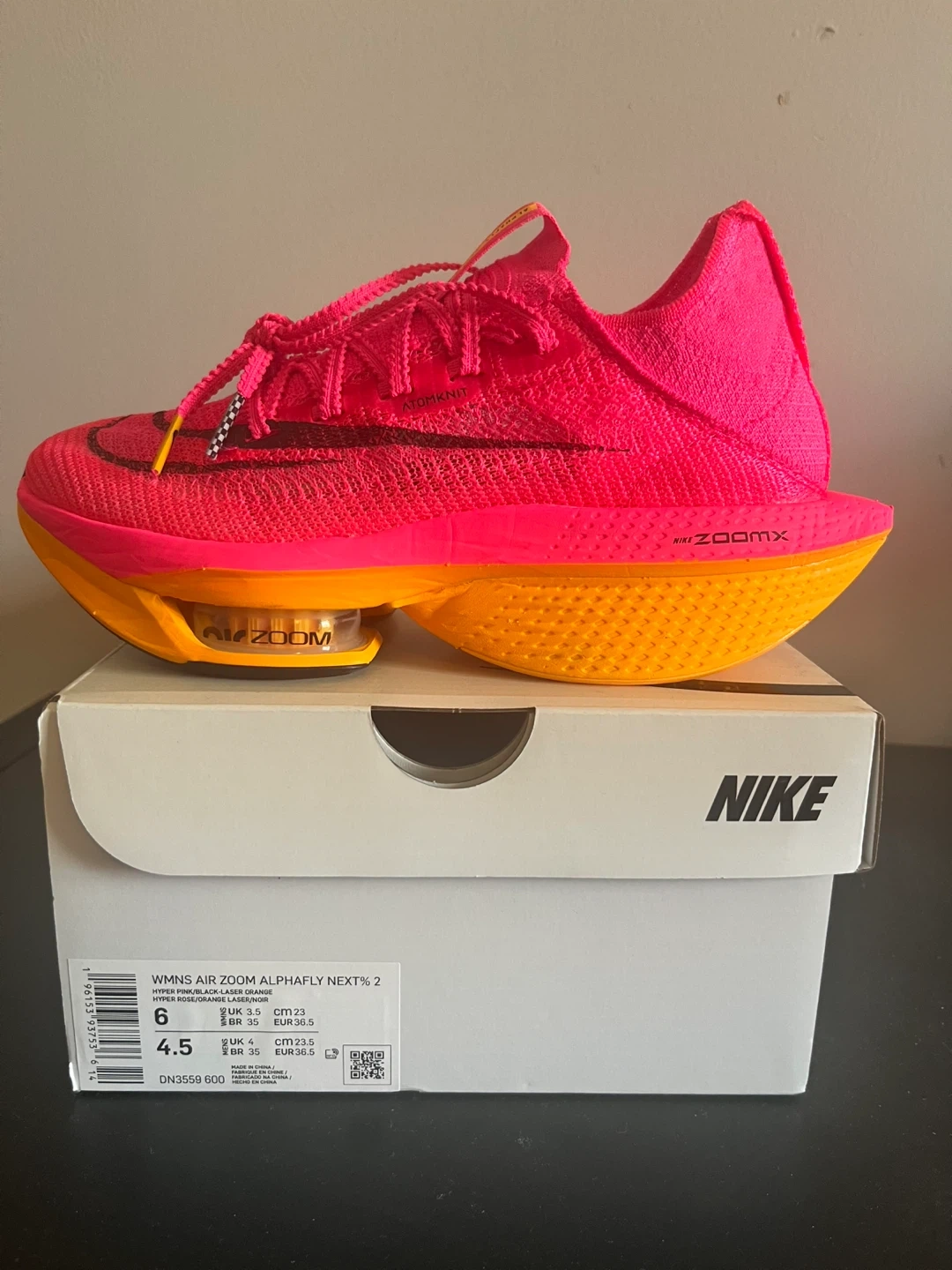 Never worn! Selling a pair of Nike Air Zoom Alphafly NEXT% 2 in women's size 6. These are in hyper pink, black, and laser orange. The Atomknit material provides a lightweight and breathable fit. Comes with the original box!