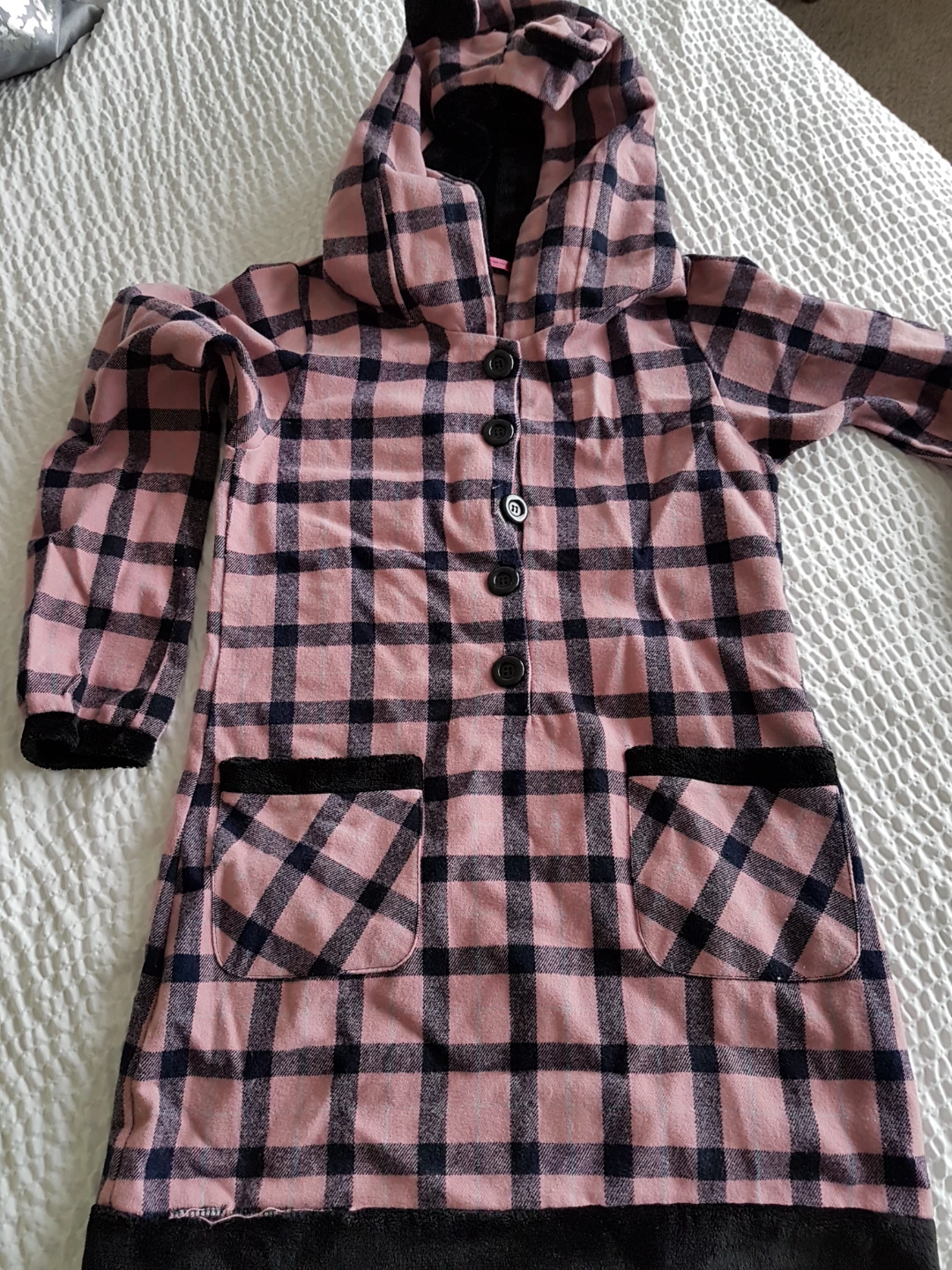 Cute and cozy hooded dress from Yangpa Zoomoney! It features a pink and black plaid pattern with black faux fur trim around the hood and pockets. Perfect for cooler weather! Please also check out my other listings on this account. This is a no pet/ smoke home. Pick Up Cochrane, Alberta