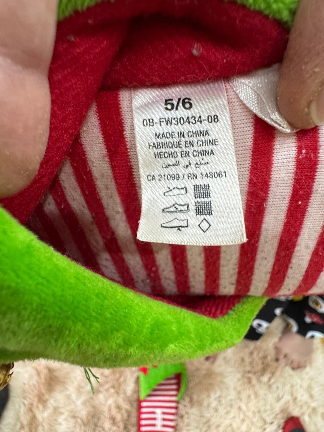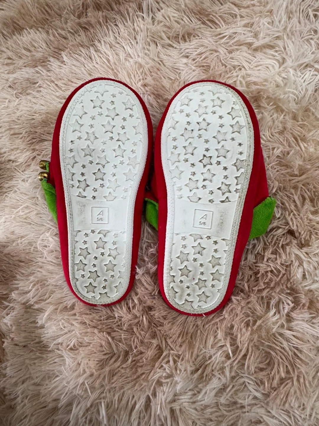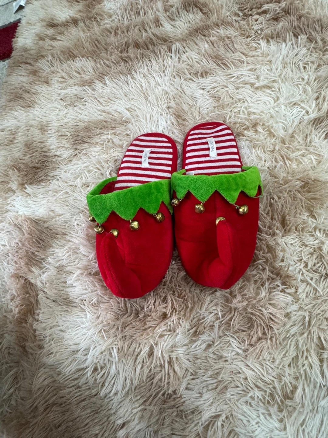 These super cute Ardene elf slippers are perfect for the holidays! They're red with green trim and little gold bells. The size is 5/6.