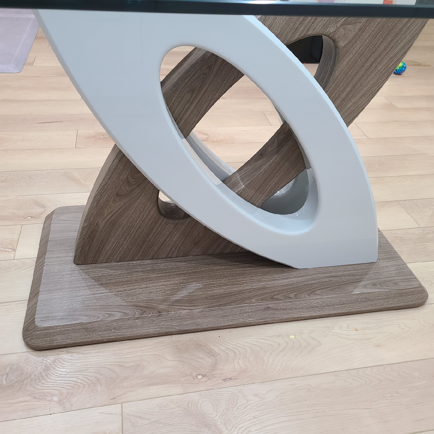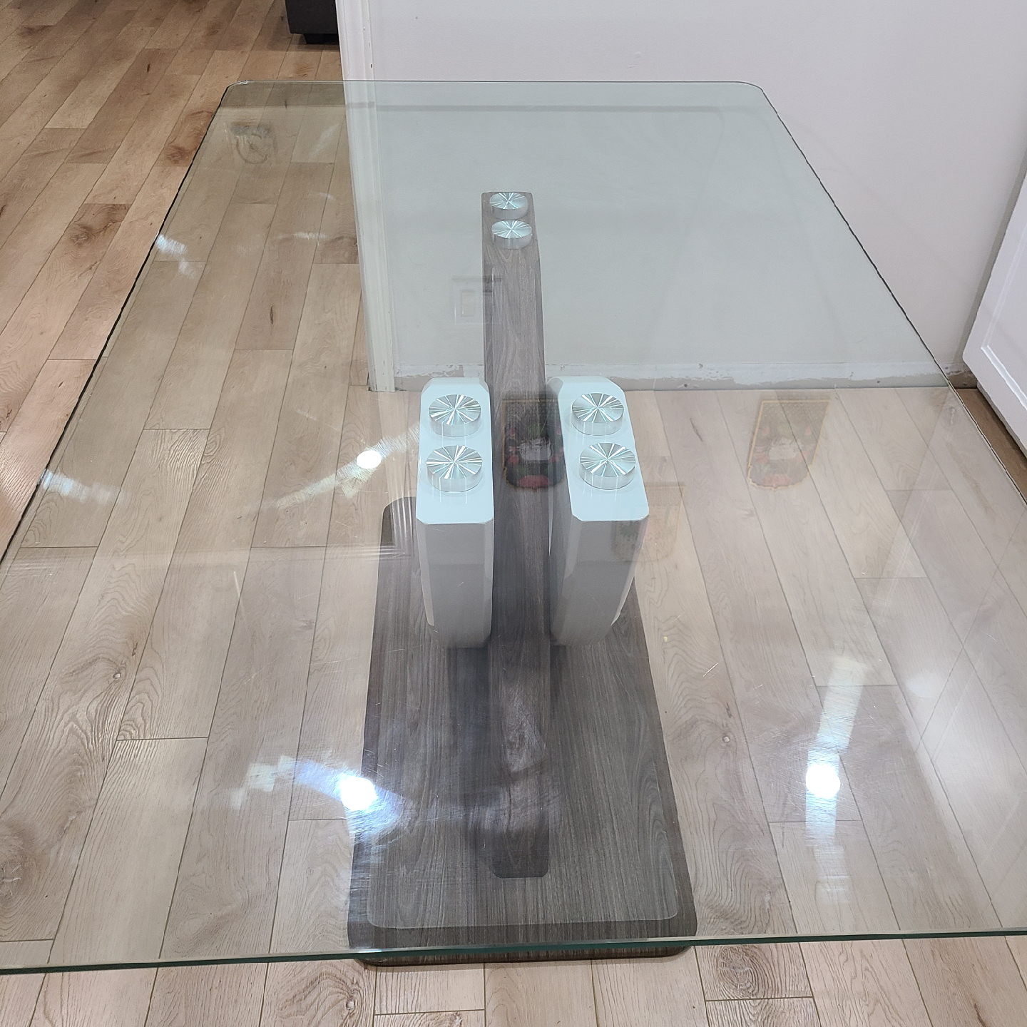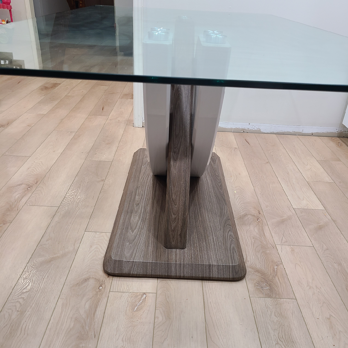 Selling a modern dining table with a glass top and a unique, stylish base. The base features a wood-look finish with white accents, adding a contemporary touch to any dining space. It's in great condition and ready to be the centrepiece of your dining area!