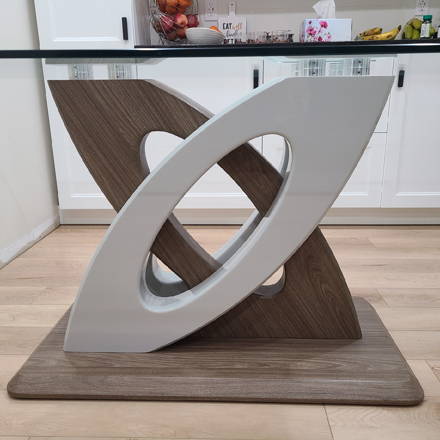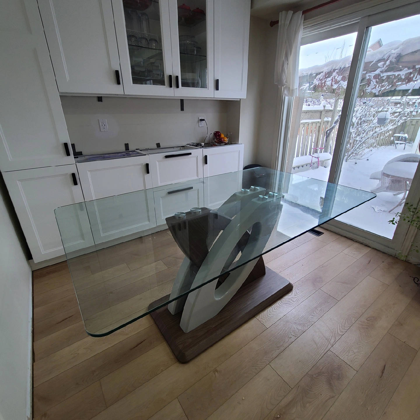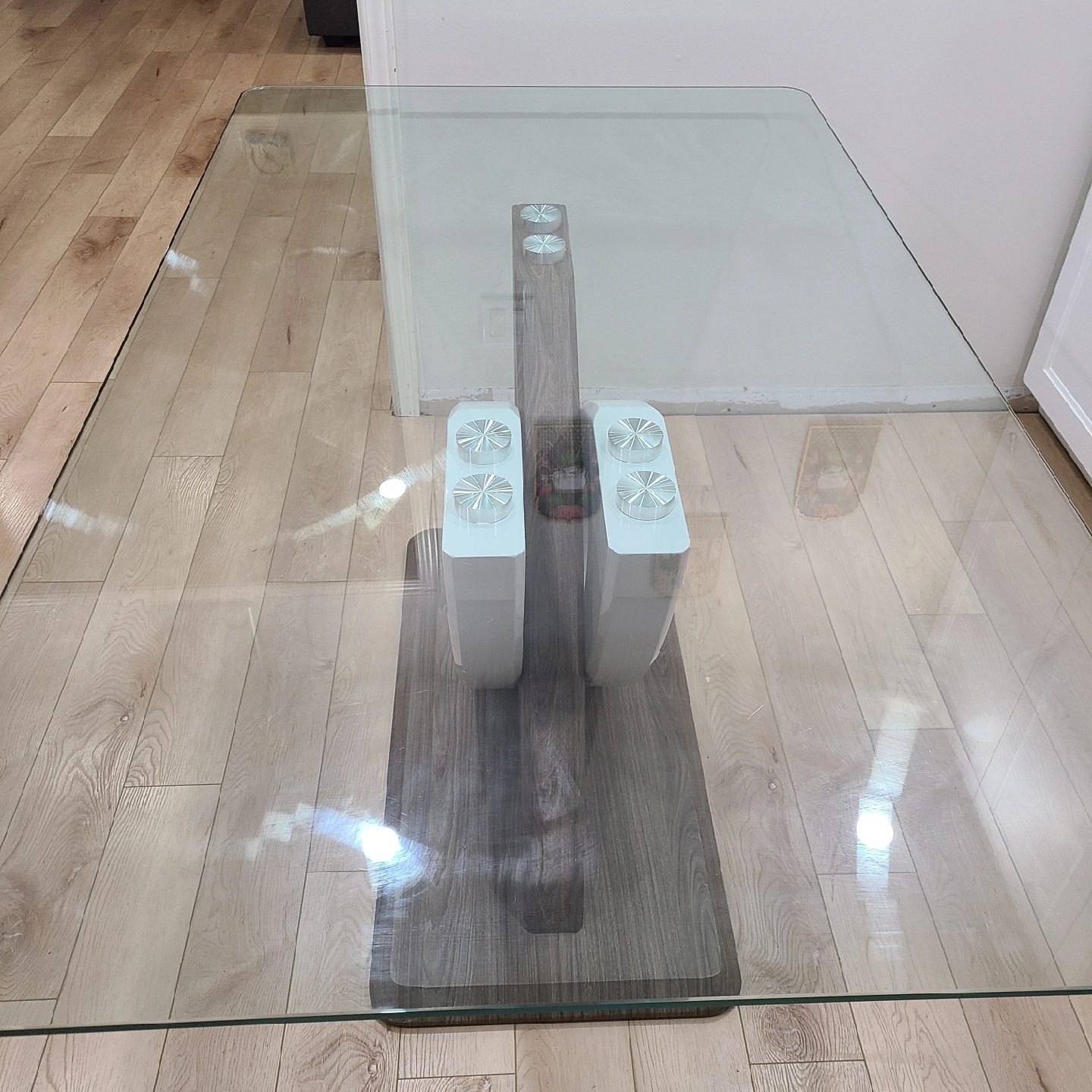 Selling a modern dining table with a glass top and a unique, stylish base. The base features a wood-look finish with white accents, adding a contemporary touch to any dining space. It's in great condition and ready to be the centrepiece of your dining area!