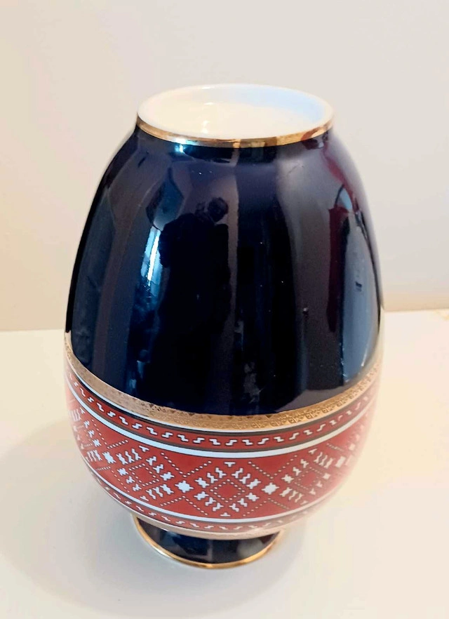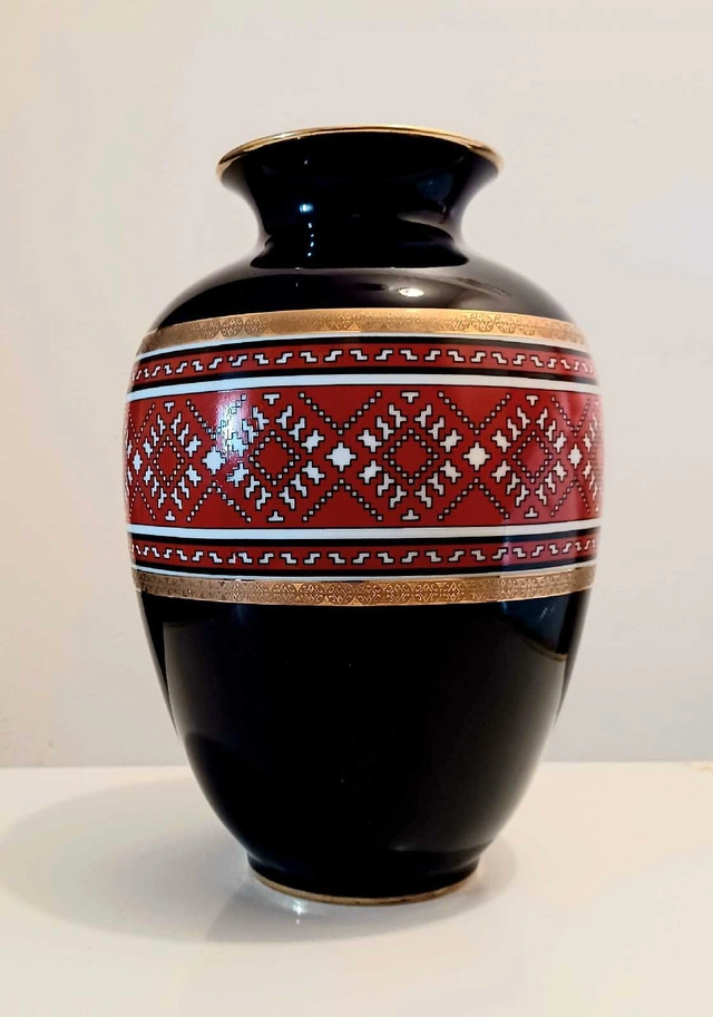65Stunning black porcelain vase stamped "Made in Germany," #77/4, featuring a distinctive red, white, and gold pattern around its centre. It's in great shape and ready to be showcased! Please check out my other rare collectibles!
