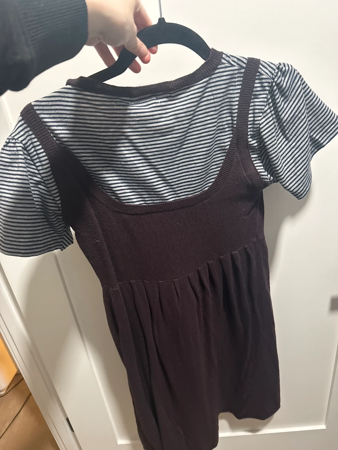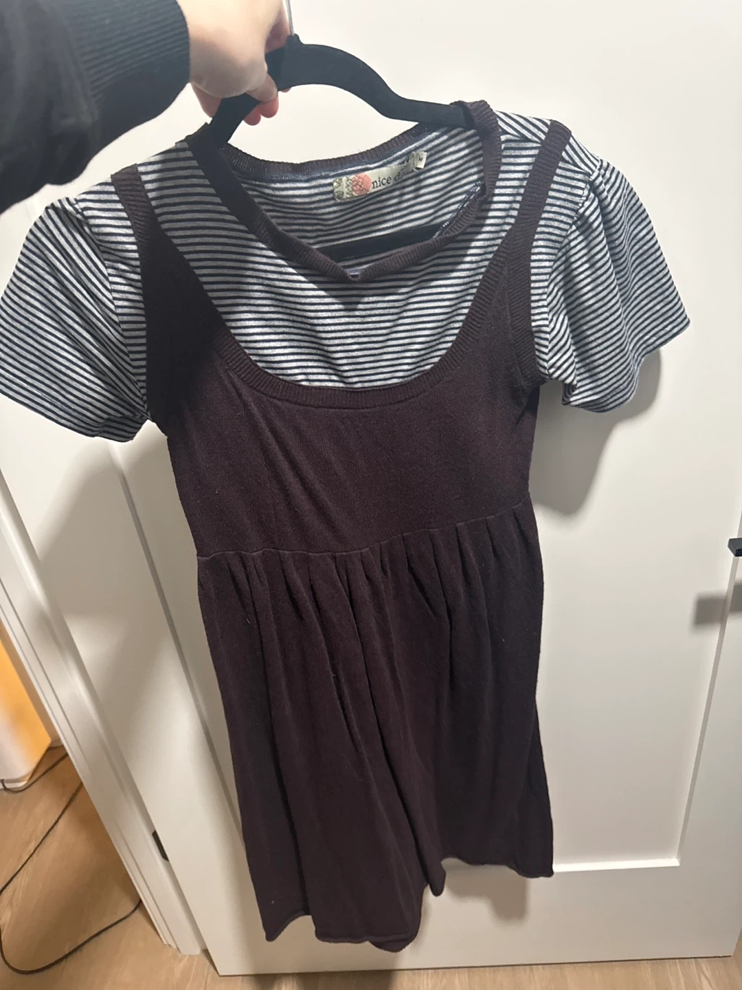 This is a cute brown dress from Nice Claup! It features a striped top and a solid brown bottom. It's in great condition