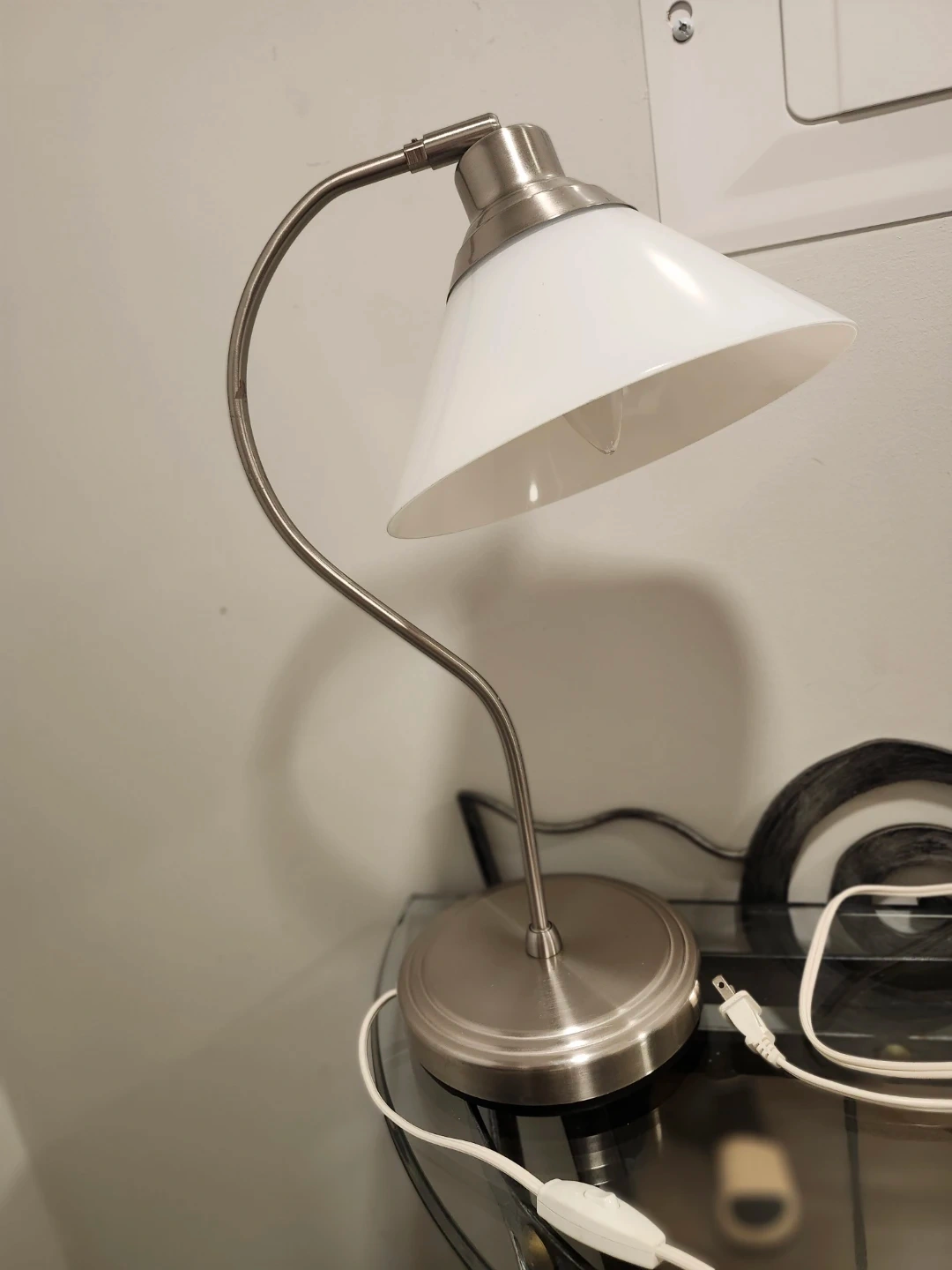 1000+Here's a lovely desk lamp that would look great in any room! It has a white shade and a siver toned base and stem. It's in great condition and ready to brighten up your space. *Bulb included Dimensions: Diameter of Shade 9 inches and Lenght 19 inches