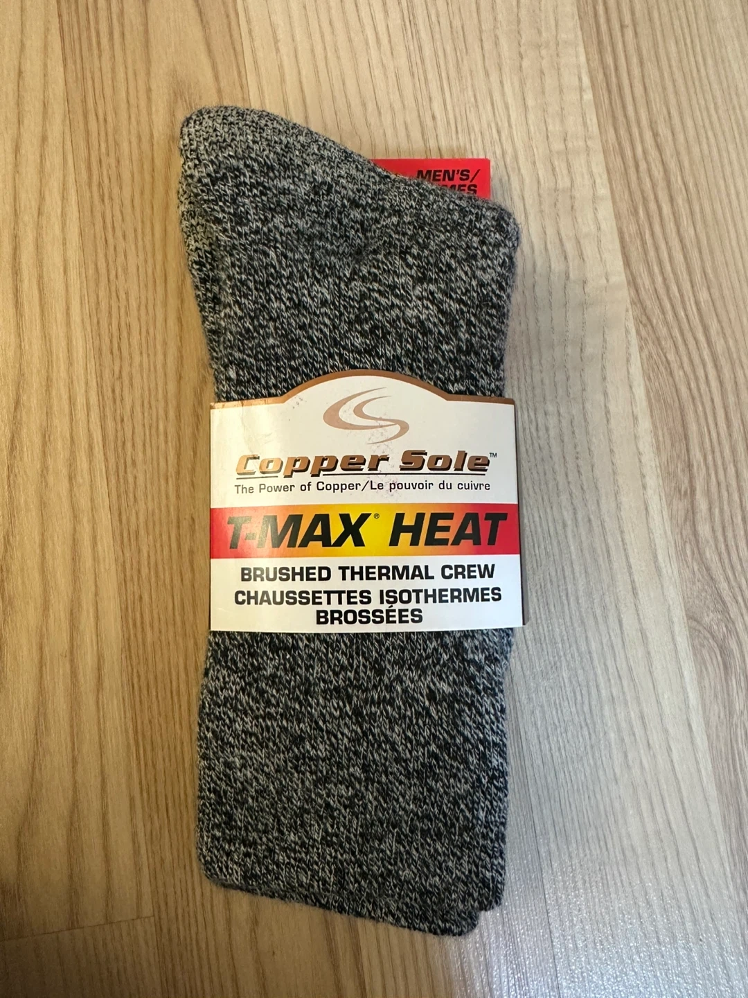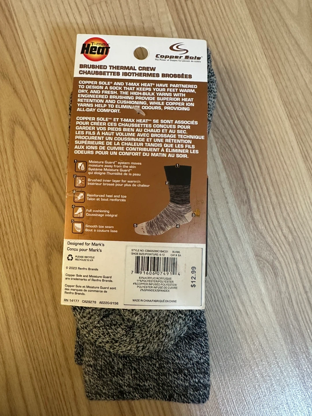 109These Copper Sole T-MAX HEAT brushed thermal crew socks are designed for Mark's. They feature copper sole and T-MAX HEAT that have partnered to create socks that keeps your feet warm, dry, and fresh. The high bulk brushing provides superior heat retention and cushioning. Moisture Guard system moves moisture away from the skin. Originally bought for $12.99