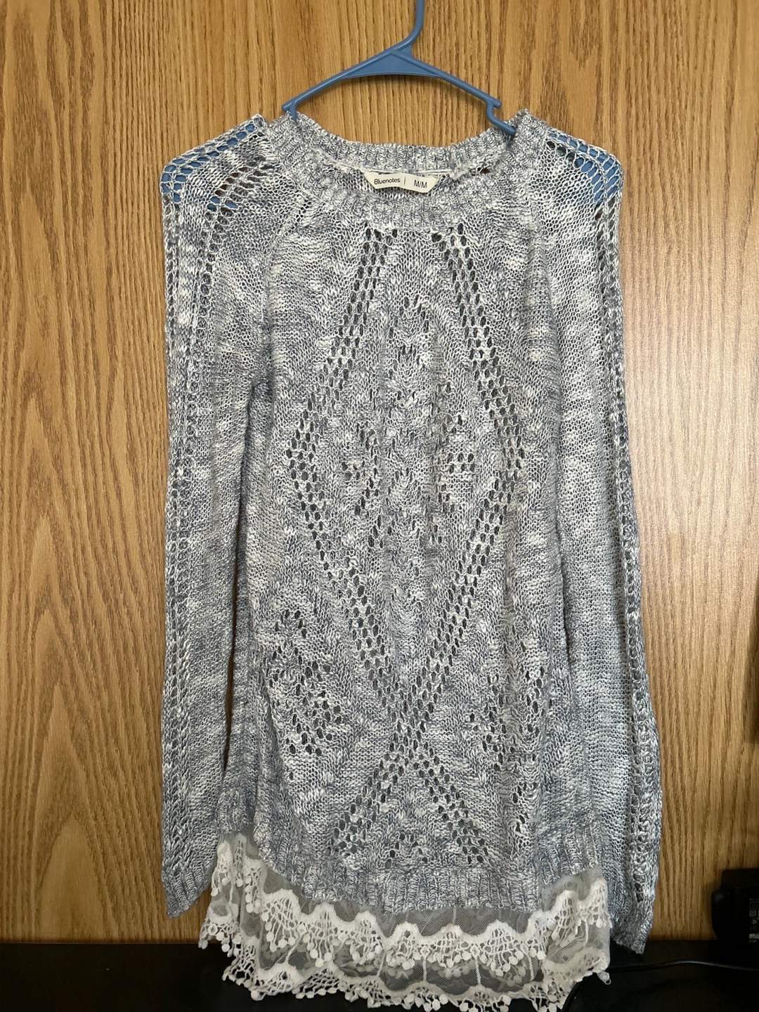 Cozy Bluenotes sweater in a lovely open knit pattern! It's a size M and features a delicate lace trim at the bottom. Perfect for layering or wearing on its own