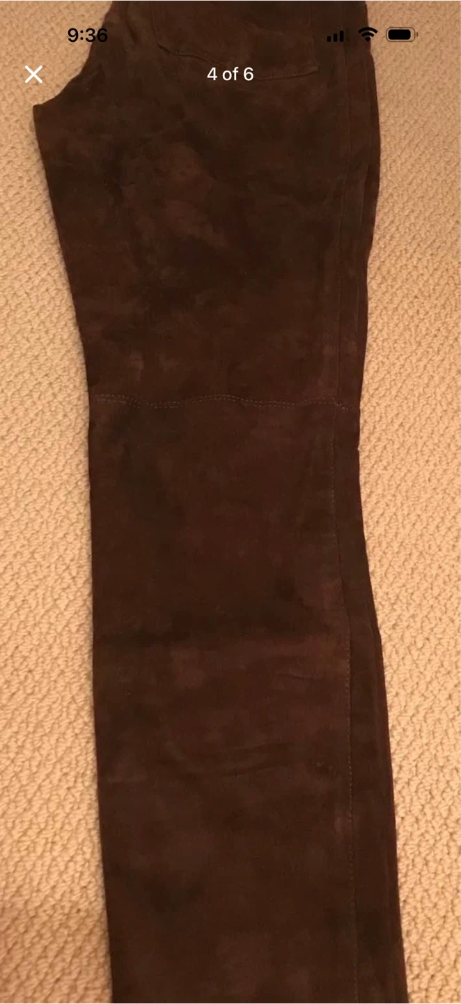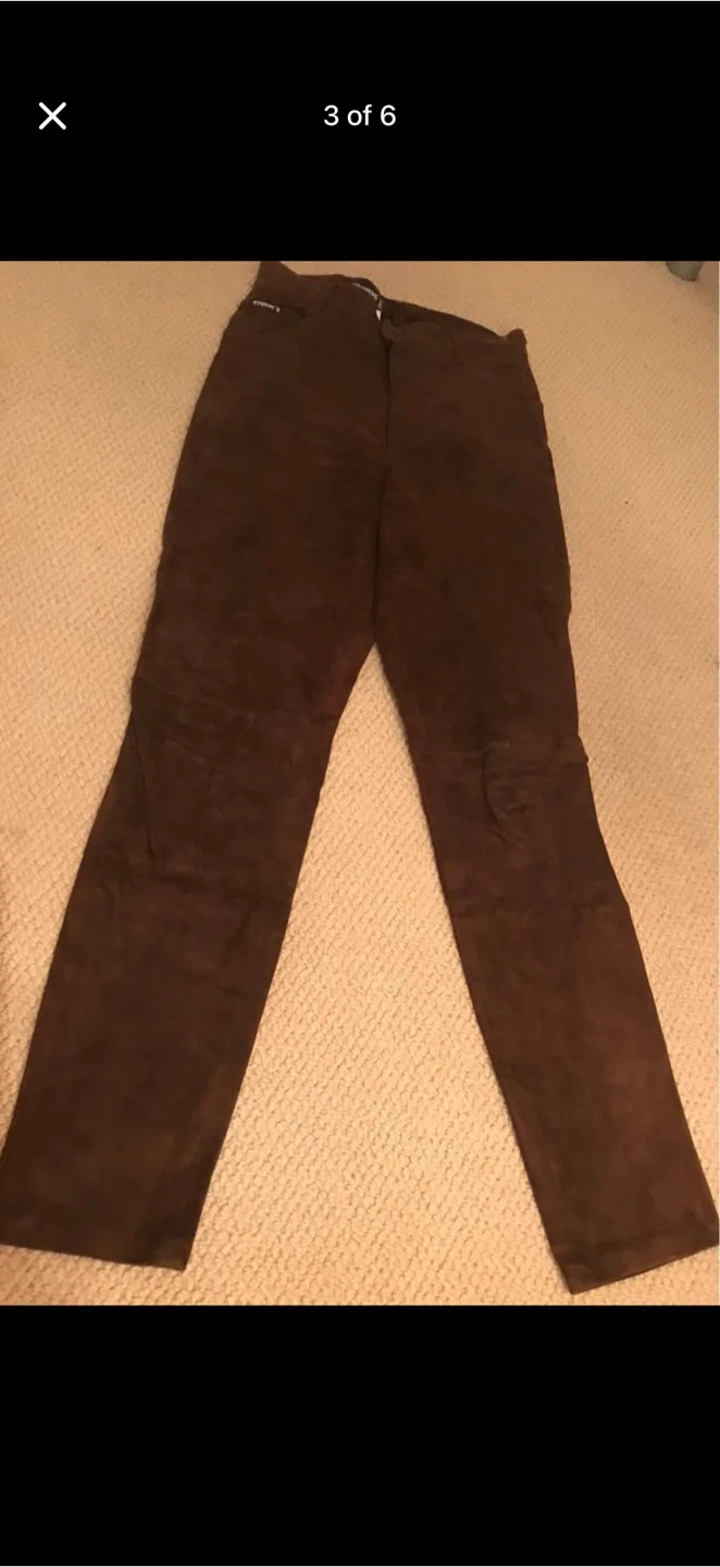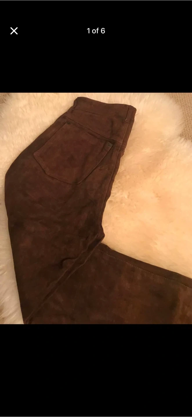 26Selling a pair of beautiful “Tark '1 “real suede stretch pants in a lovely brown colour. This is real suede ,made in Paris bought for 400 $ , high waisted. Worn only a couple of times and in excellent condition no stain or issues. It has a straight cut and hugs the body. Size 2 European, which is XS , approximate measurements: Waist 65 cm/ hips 75 cm /waist to hem 100 cm . You can try and decide .Cash only pls.
