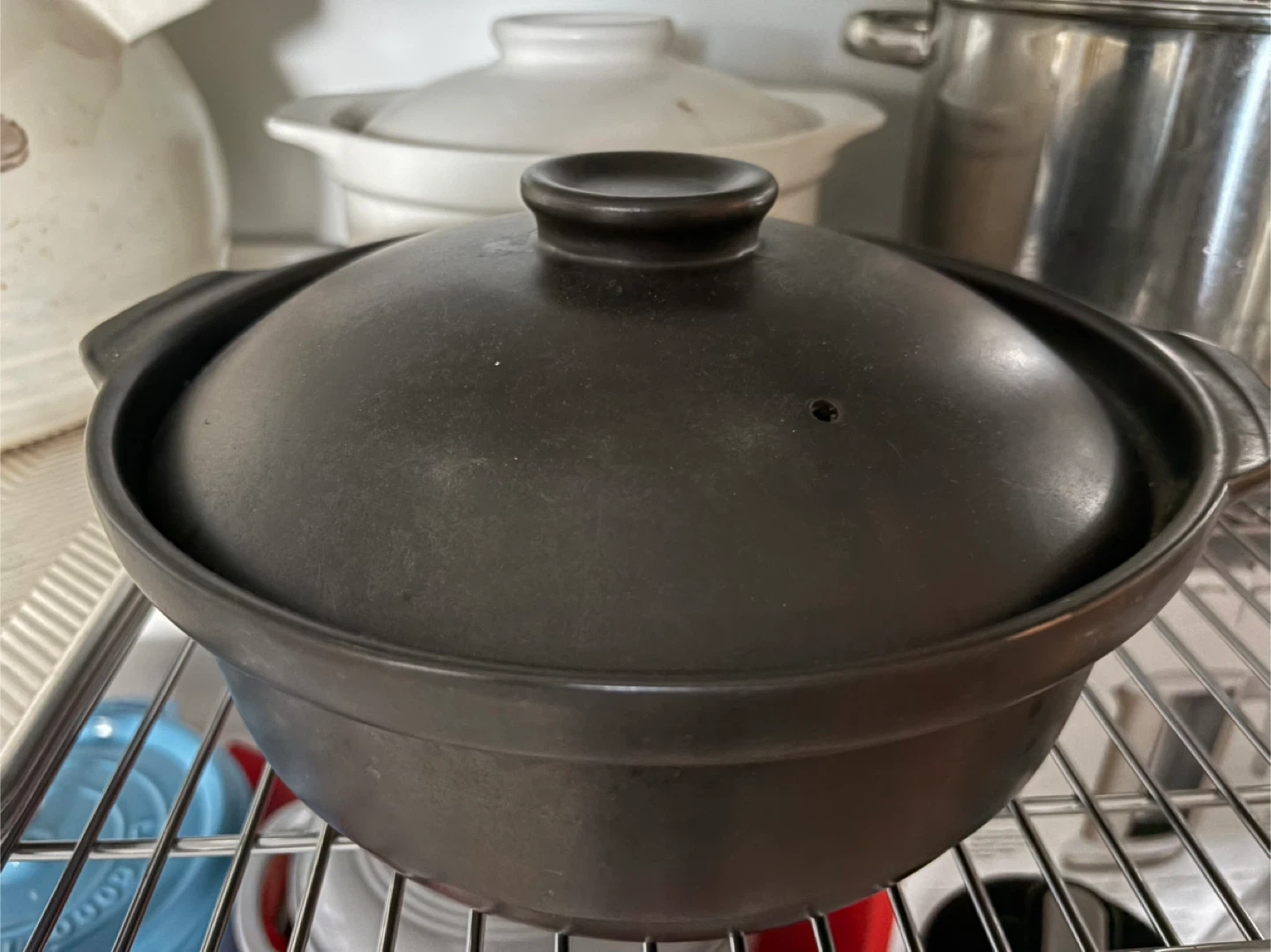 Selling a black clay pot with a lid. It's in good condition and ready for making some delicious meals! Perfect for soups, stews, or rice dishes