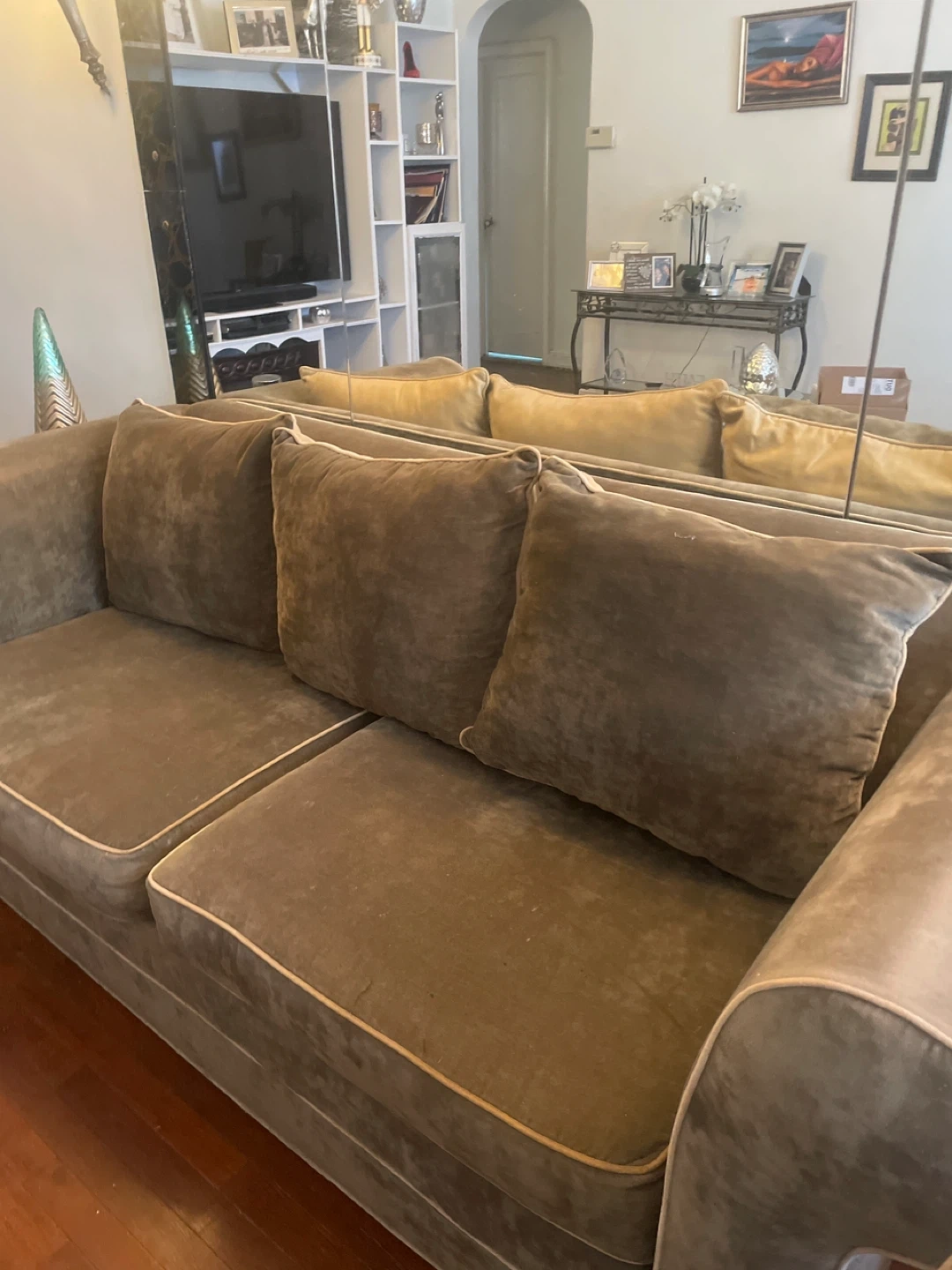 Selling a comfortable sofa and loveseat set in a lovely olive green color. This set is perfect for a living room or den. The cushions are plush and supportive, making it a great place to relax. The neutral color makes it easy to match with any decor