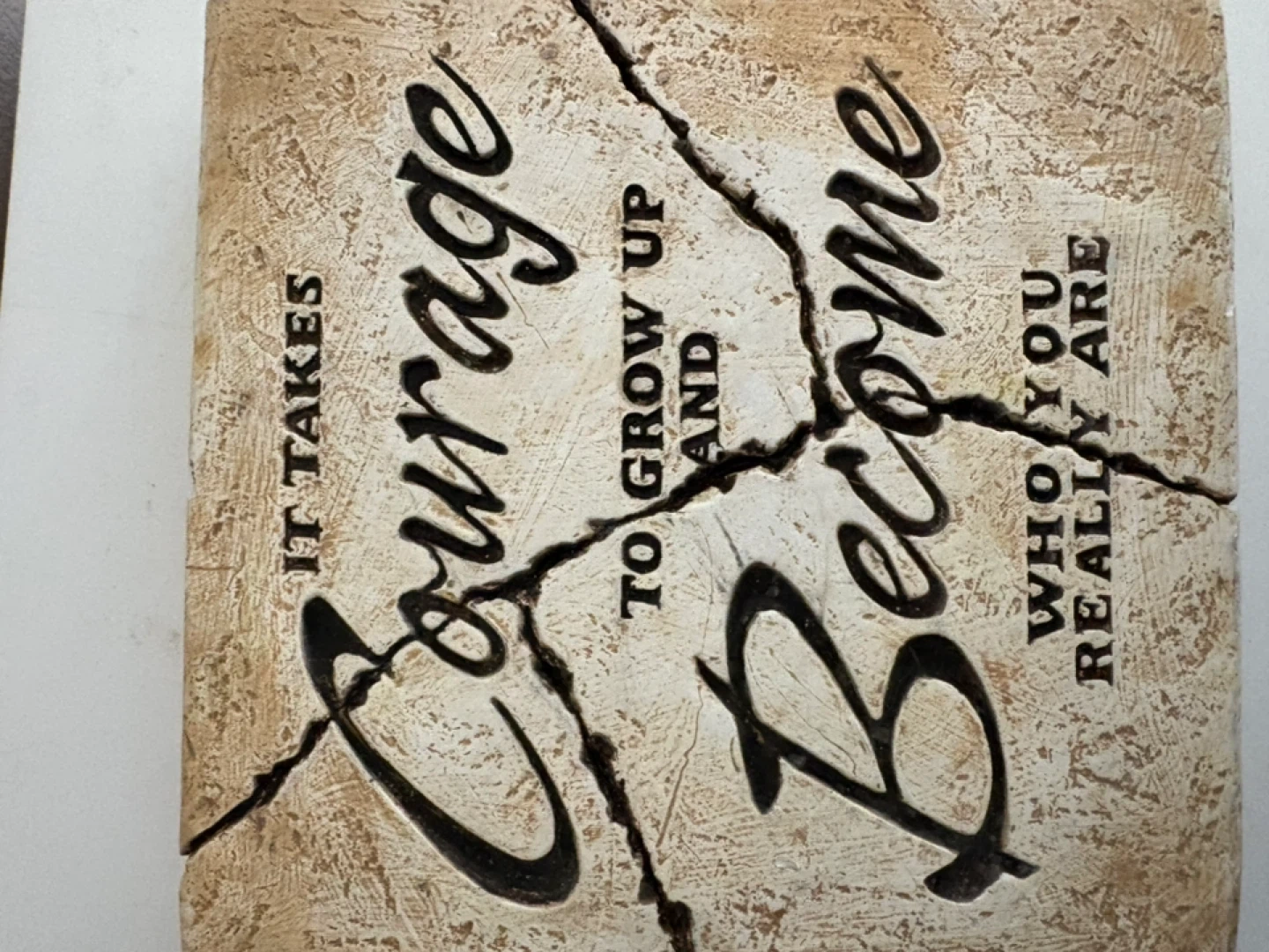 This stone plaque features the inspiring message: "It takes courage to grow up and become who you really are" It's a lovely piece to add some inspiration to your home or office space