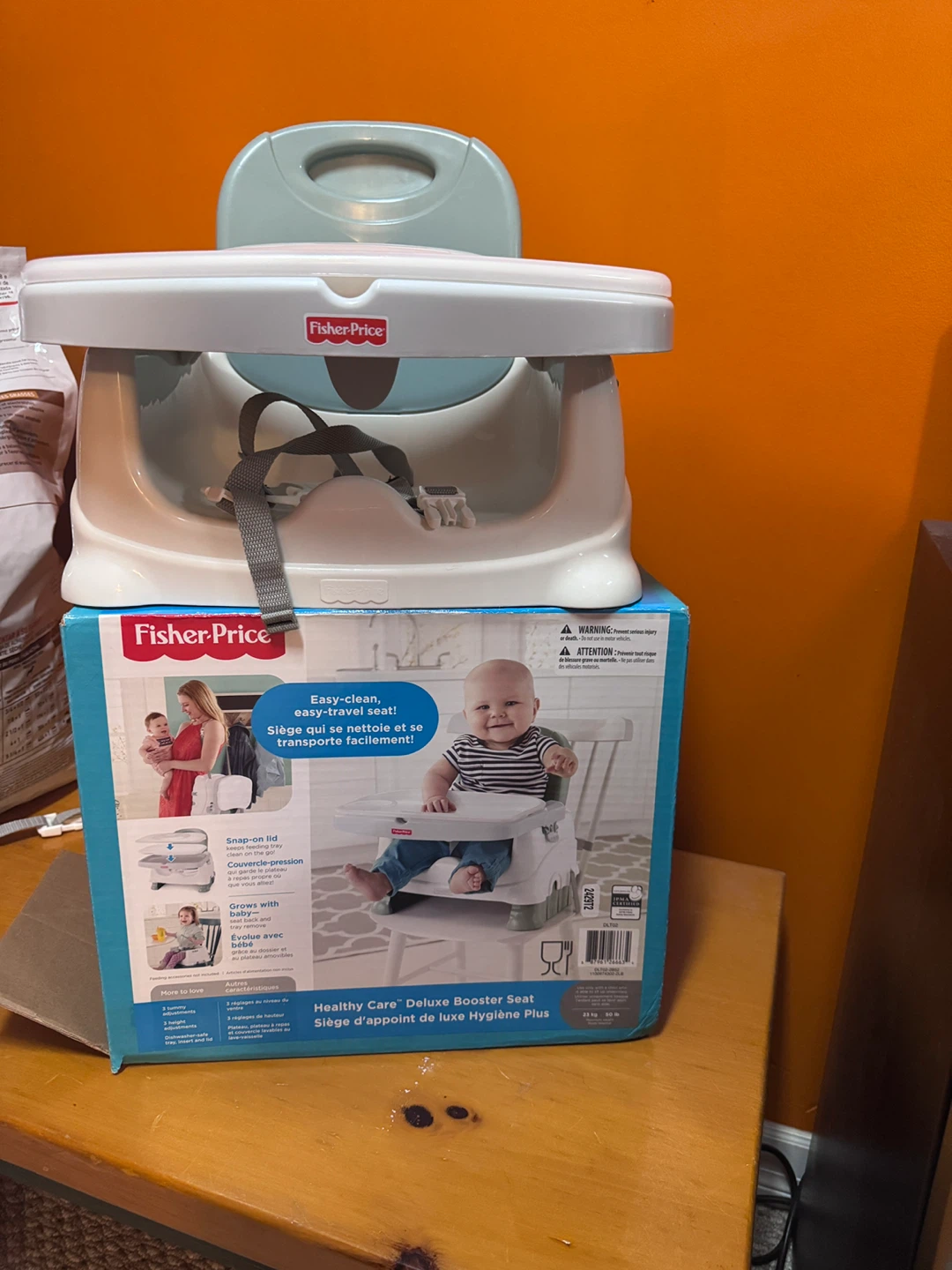 Selling a Fisher-Price Healthy Care Deluxe Booster Seat! This seat is easy to clean and transport. It features a snap-on lid and a comfortable seat. It's in great condition and ready for a new home!