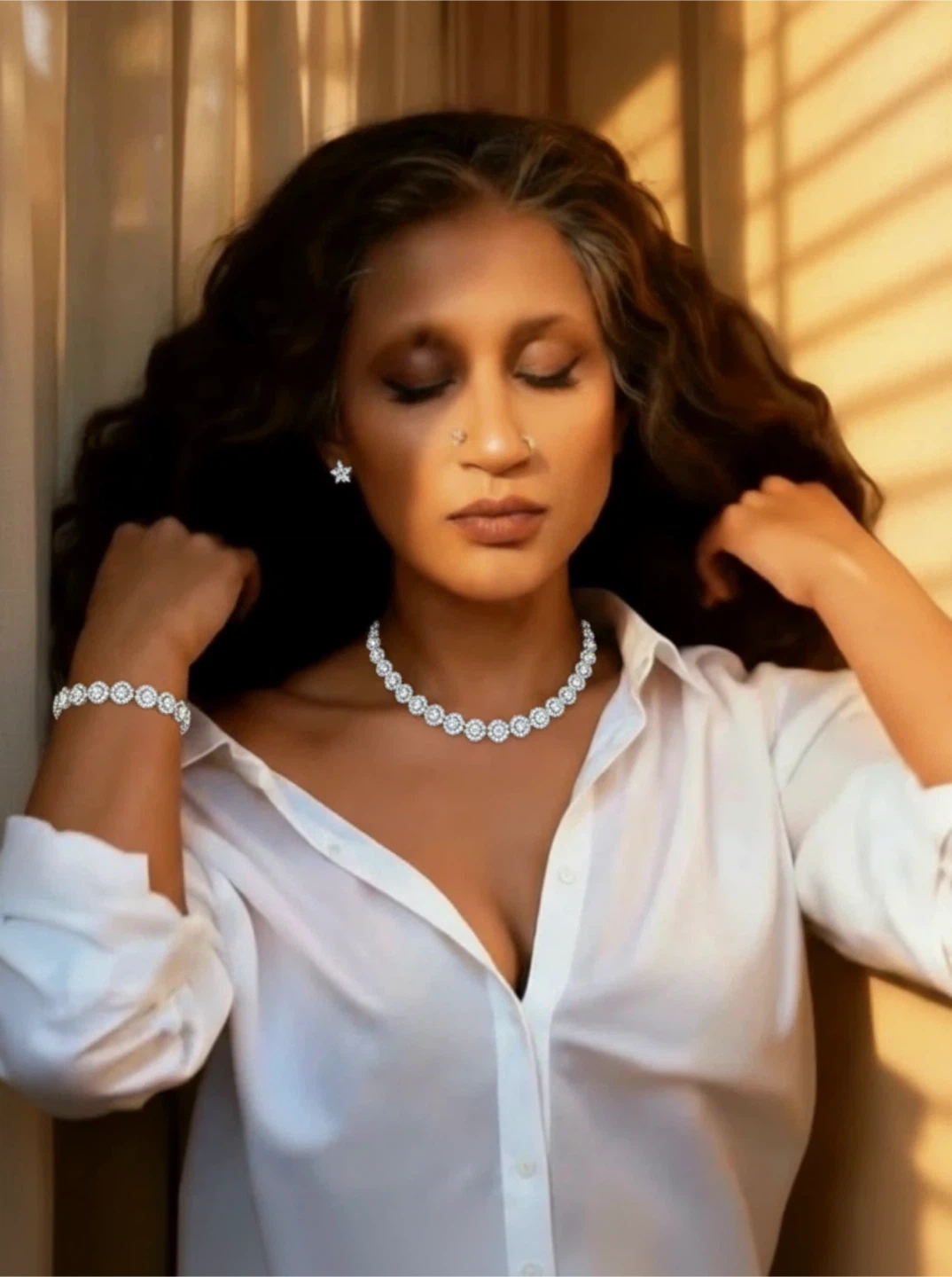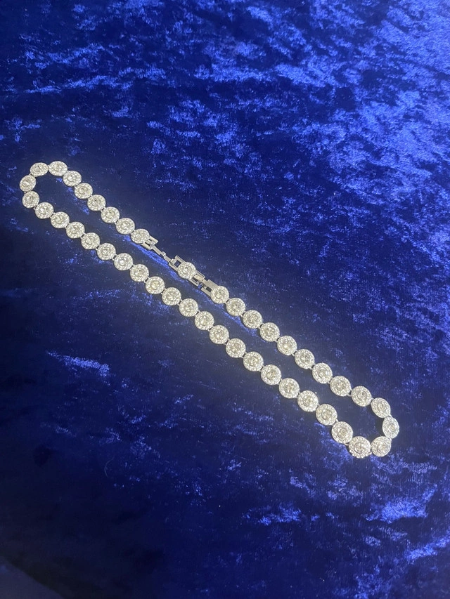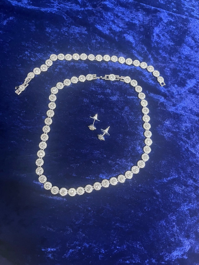 The set includes a dazzling necklace, a bracelet, and a pair of earrings, all adorned with brilliant stones. * **Includes**: Necklace, Bracelet, Earrings * **Style**: