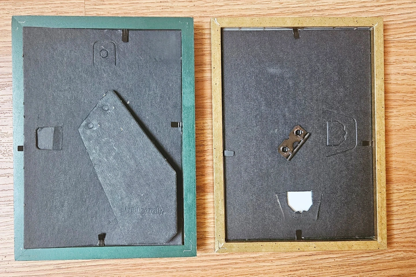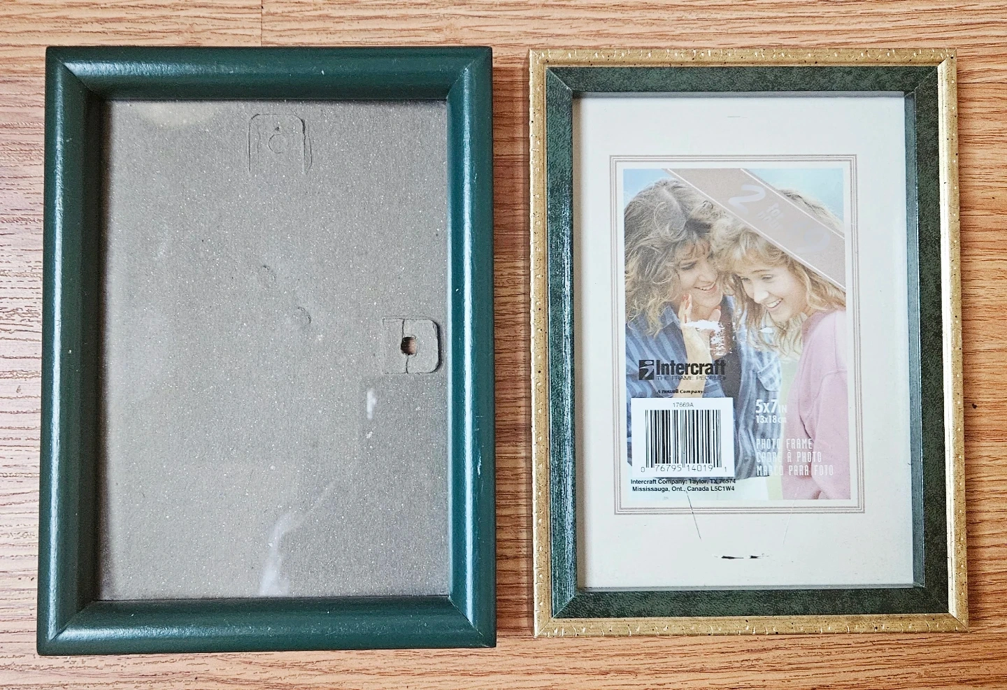 Two picture frames! One is a green colour and the other is gold and green. Both are 5x7 in size and ready to display your favourite photos.