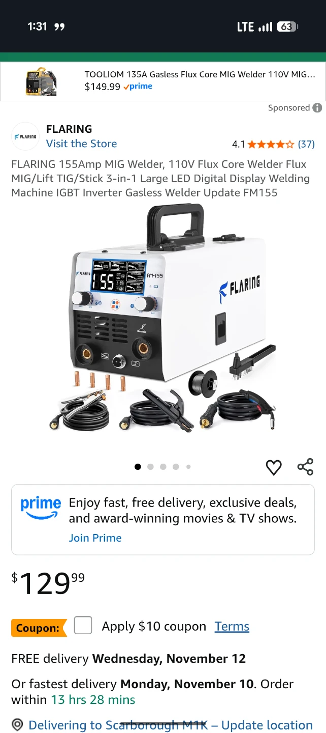 Selling a BRAND NEW FLARING 155Amp MIG Welder, model FM-155. It's brand new in original packaging and comes with the box. The welder is a 110V Flux Core Welder and is a 3-in-1 Large LED Digital Display Welding Machine IGBT Inverter Gasless Welder Update. The box indicates the size is 470x310x330 MM and the weight is 10.4KG.