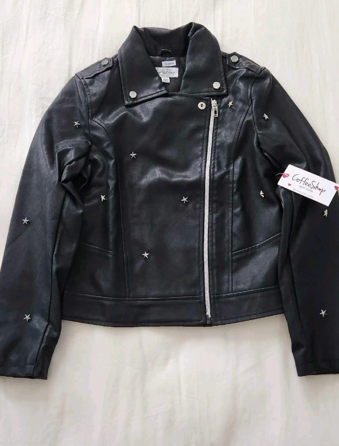 20Here's a CoffeeShop black faux leather jacket! It's new and features a stylish design with star embellishments. Perfect for adding a bit of edge to any outfit for tweens! Size L (12)