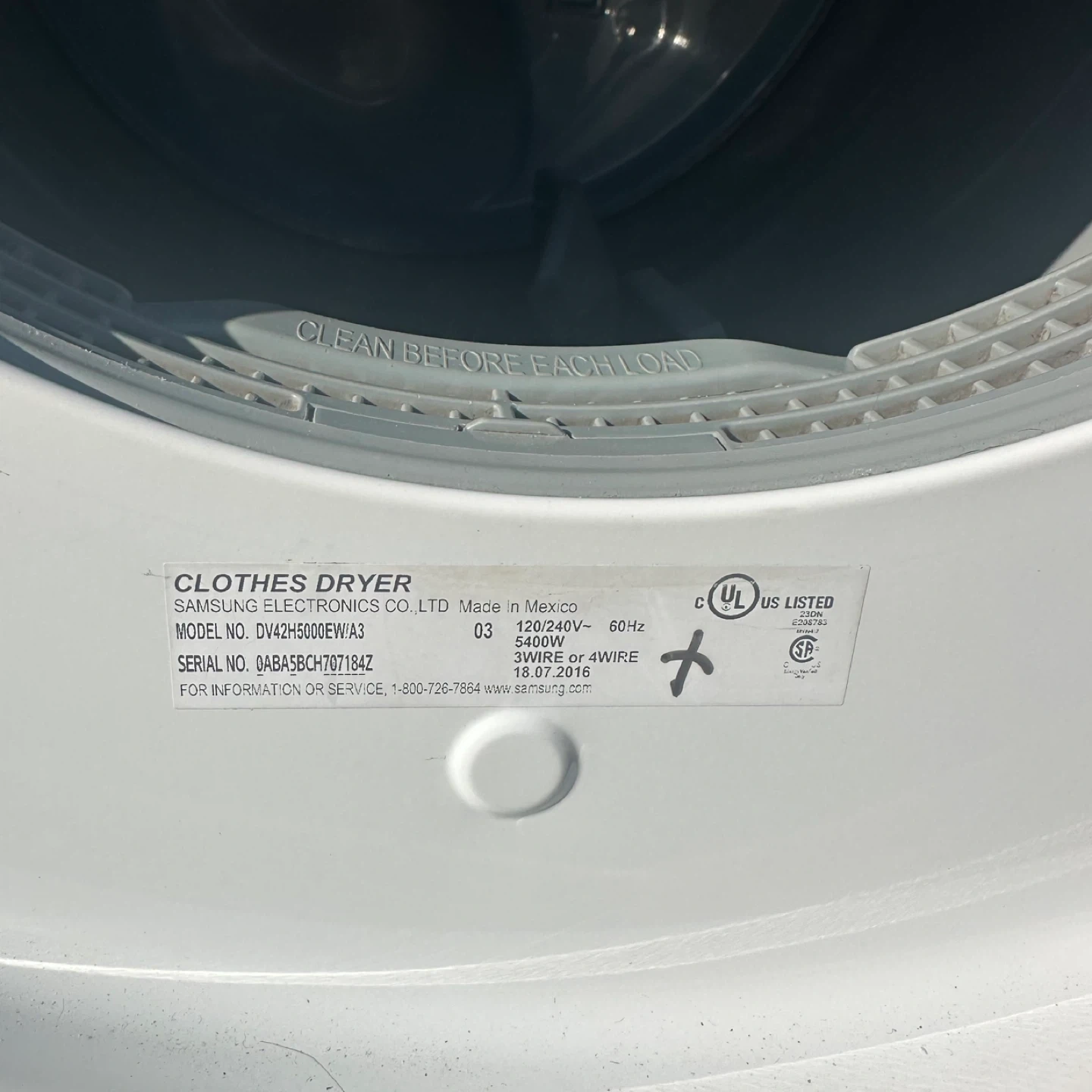 75Selling a Samsung clothes dryer, model number DV42H5000EW/A3. It's in good working condition and ready for a new home. This dryer is made in Mexico and operates at 120/240V, 60Hz, and 5400W. It's designed for 3-wire or 4-wire connections. Feel free to ask any questions!