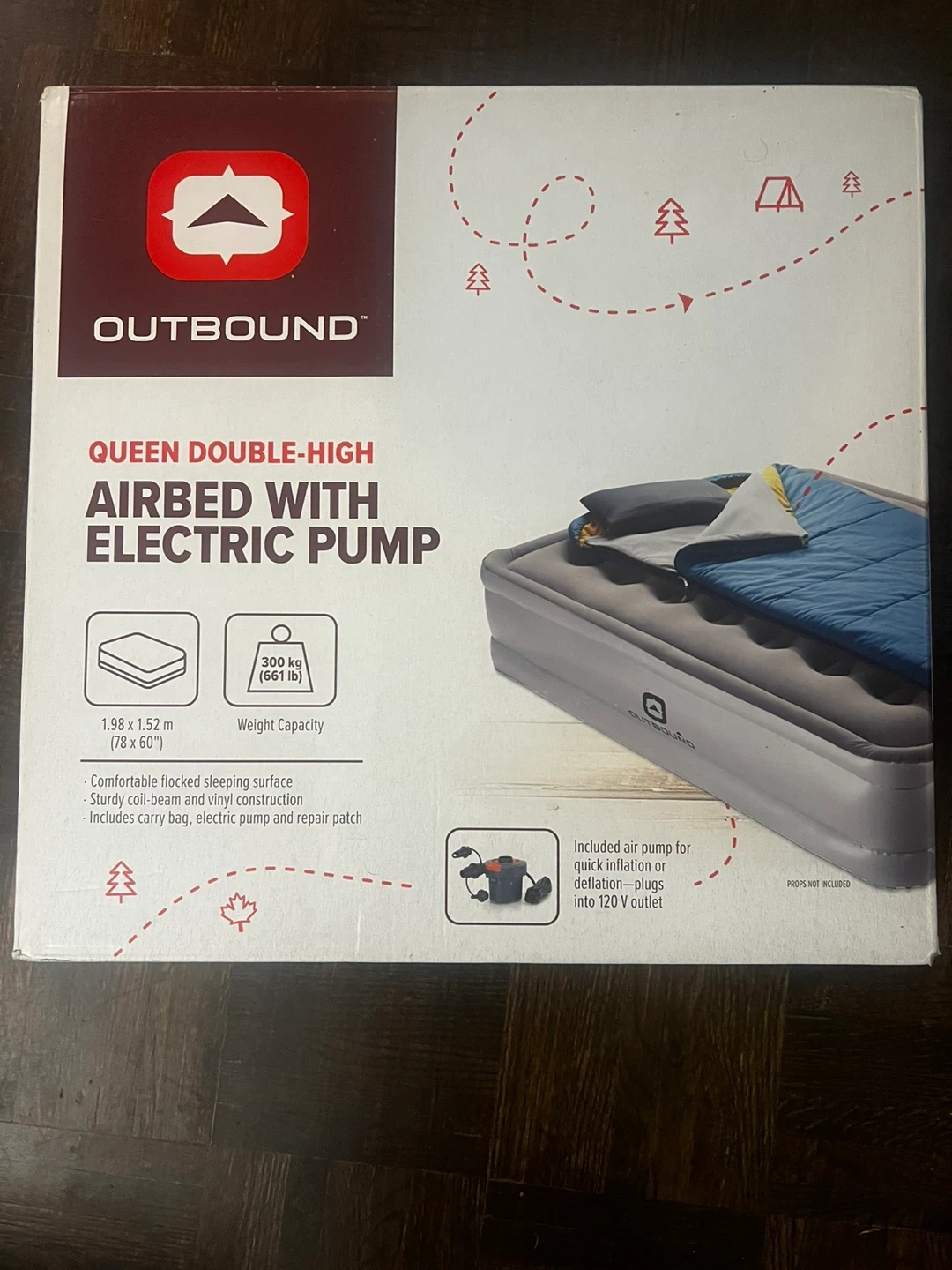 Selling an Outbound queen double-high airbed with an electric pump! It has a comfortable flocked sleeping surface and sturdy coil-beam and vinyl construction. It measures 1.98 x 1.52 m (78 x 60") and has a weight capacity of 300 kg (661 lb). Included is an electric pump.