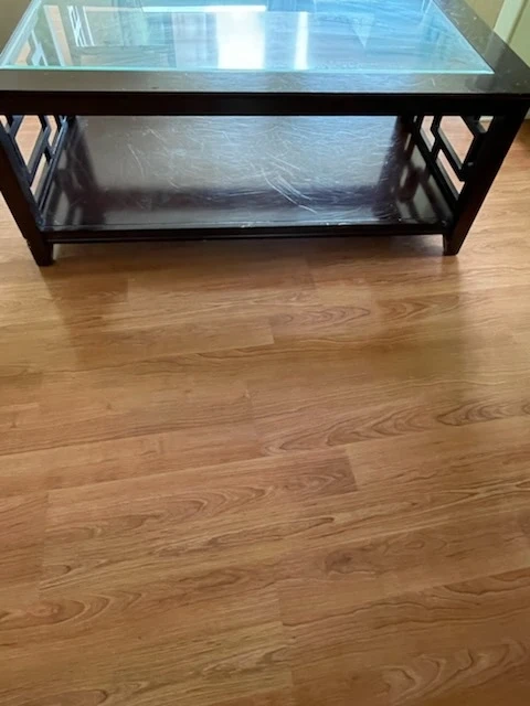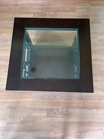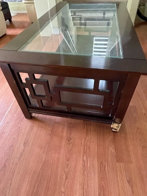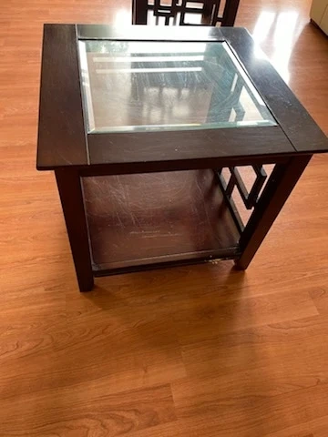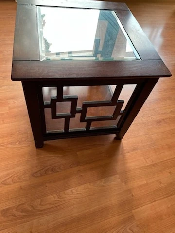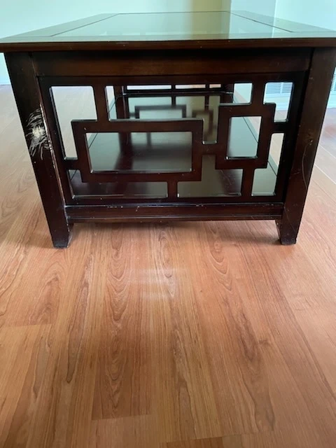 10Selling a dark brown coffee table with a glass top and 2 square matching side tables. It has a unique geometric design on the sides and a shelf underneath for storage. There are some signs of wear, as shown in the photos.