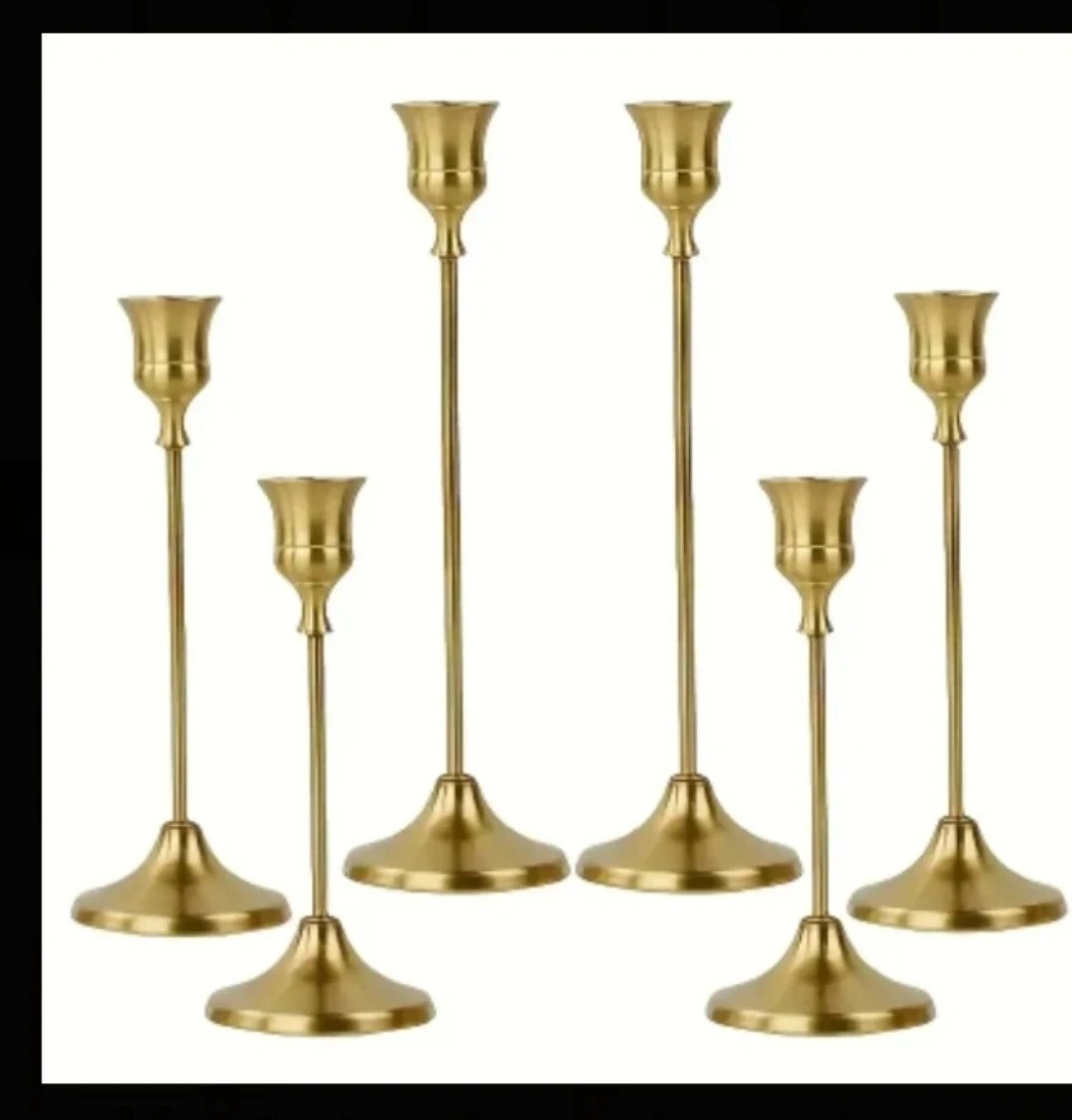 Selling a set of 6 gold-toned metal candlestick holders! They come in three different sizes: small (17cm), medium (20cm), and large (23cm). Perfect for adding a touch of elegance to any room. They are still in their original packaging and come with the box