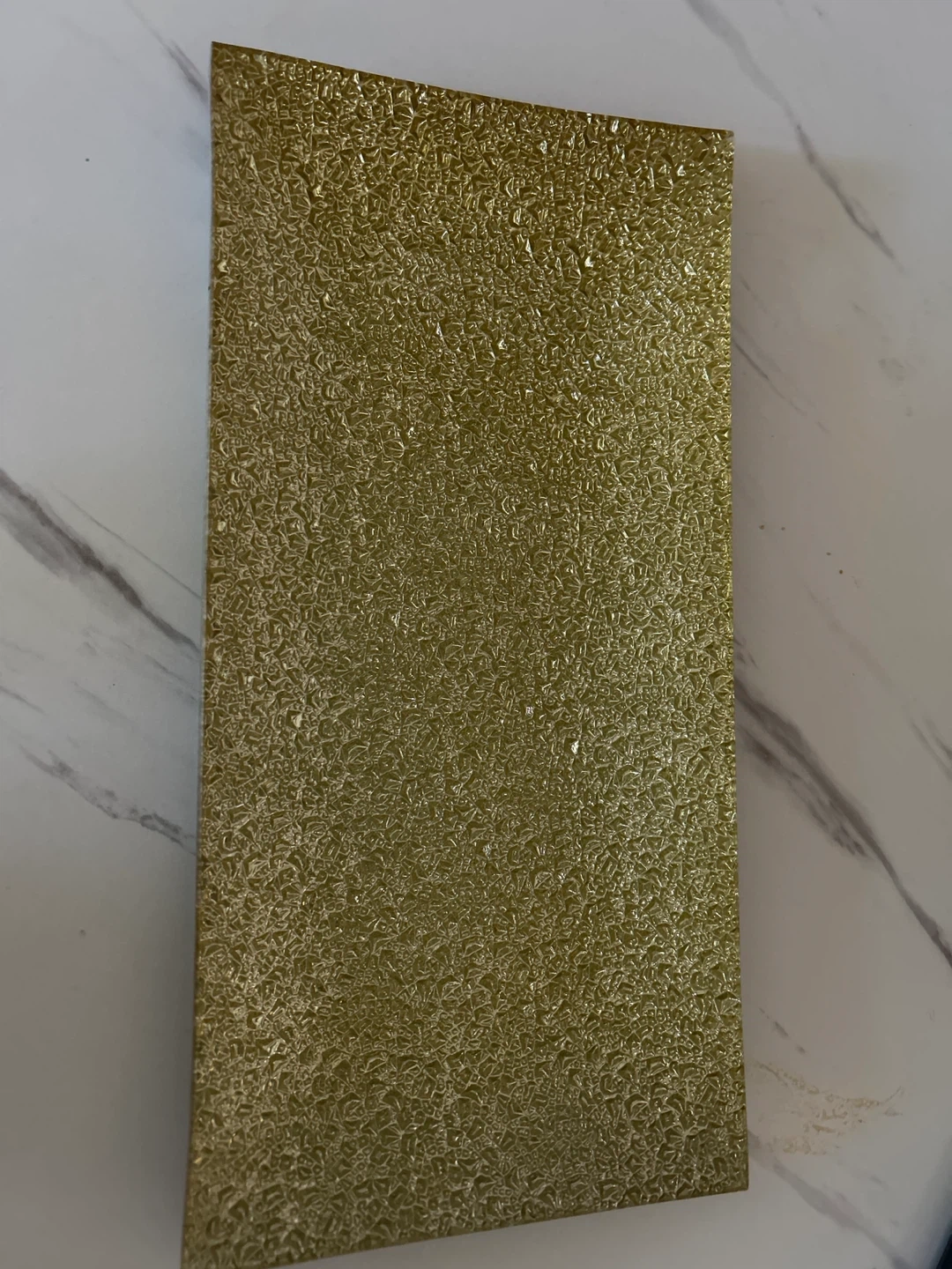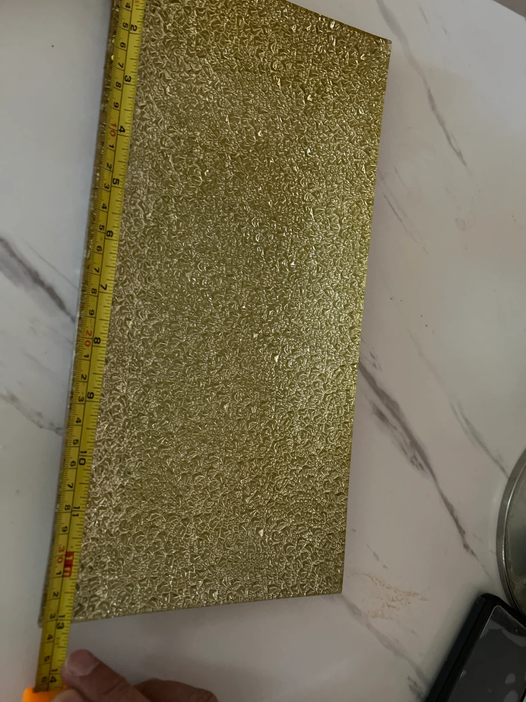 396Here's a textured gold panel, measuring approximately 6 inches by 12 inches. It has a unique textured surface that catches the light nicely. Perfect for adding a touch of elegance to any project! Can also use to put your candles or decor.